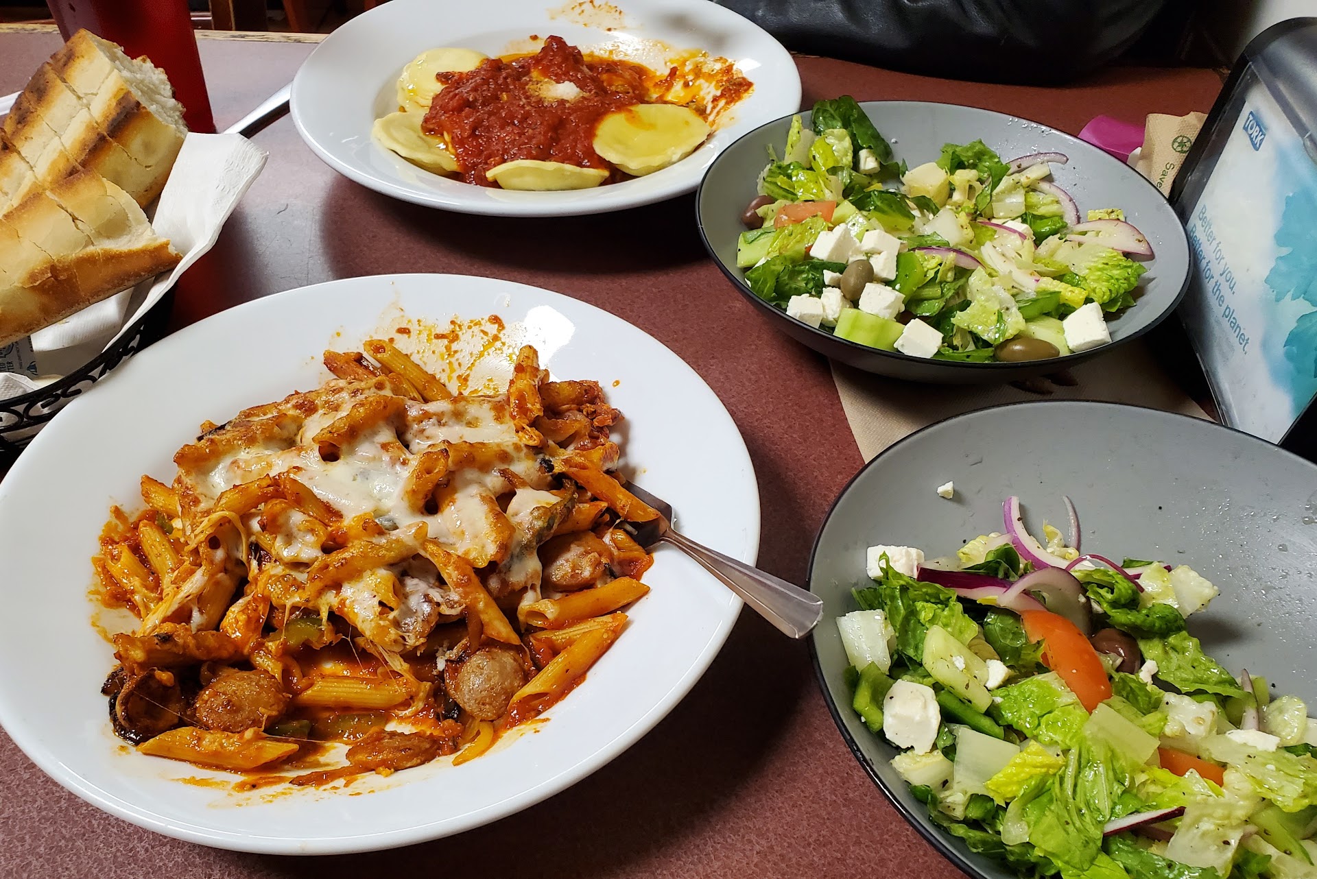 Read moreWe went on Friday, Jan. 5. It is a small place, but it was not crowded. All employees were busy at the moment, so we grabbed menus off the counter and seated ourselves... but someone arrived in short order to, well, take our order: 2 small Greek salads, meat ravioli, and sausage, peppers and onions with penne pasta.