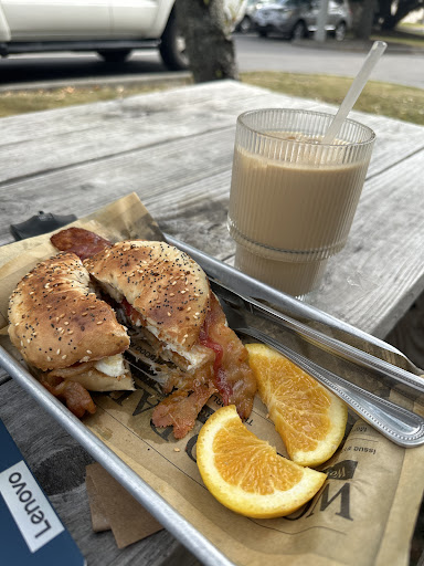 i got a small iced vanilla latte with oatmilk and baileyâs, very tasty. my only gripe is that it seems like very little ice was put in after the fact so it was lukewarm rather than iced. bagel sandwich (i think it was the BEC, bacon egg cheese) was very tasty. it didnât come cut in half if that matters. was just shy of $30 for everything (sandwhich and coffee) because of the baileyâs in the coffee and a couple substitutions i made. they definitely did not skimp on the baileyâs, and obviously you cant get it to go. my company got the brewrito and just to note, it wasnât grilled.