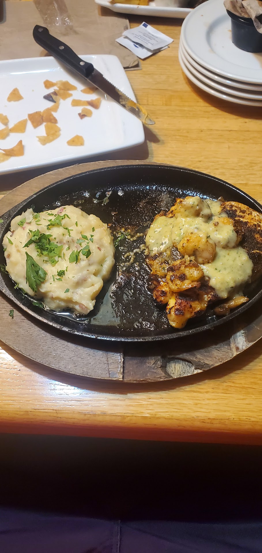 Read moreDecided to go to Applebee's because I was craving the oriental chicken salad and my husband wanted their Riblets, basket. When we checked out the menu we noticed the special 2 for $$ on the back. 1 appetizer to share (or 2 side salads) and 2 full entrees for one price, our selections were in the 2 for $30 column so we decided to try this deal item. We chose to each get a side salad and Ordered an appetizer combo for $18.99 separate from the 2 for $30 dinner deal because the selection was limited. 1st, the waitress forgot to bring the buffalo and blue cheese sauces for the appetizer. 2nd, our side salads were served WITH our appetizer instead of between app & food. Still, not the end of the world, right? Our waitress never checked on us so We asked the waiter who delivered the entrees to the table for the missing sauces and he sent the waitress back with them. My salad was pitiful - it is supposed to be 2 kinds of lettuce & shredded cabbage, mixed with crunchy noodles, slivered almonds, and oriental dressing and be topped with a fried chicken fillet, cut into bite size pieces for the salad. The salad was nearly dry of dressing, and the fried chicken was ICE Cold and looked like someone cut off the crispy breading parts of an old leftover piece of frozen chicken and hard as a rock. I was also given a cold bread stick that was so hard it clanged when tapped on the side of the plate. Still Not wanting to complain I decided to pick out the dried slivers of chicken with it's rock hard breading and just slice up some of the boneless wings from our appetizer for my salad. But it too was cold by that time. Wanting something to eat I grabbed the celery sticks that came with the boneless wings - they had rotted spots on them and were inedible. We never saw our waitress until time for the check And when I complained she "talked to her manager" and I got $5 off for rotten veggies and a salad I couldn't eat . Photos and...