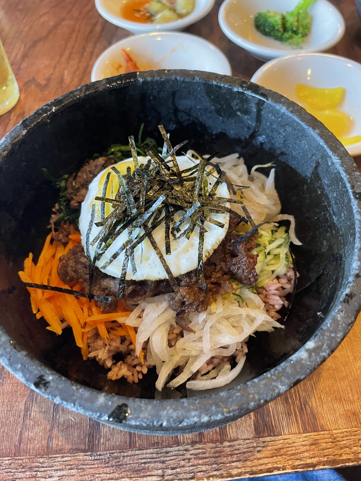 I had the BBQ Makeral as my main dish. My wife had a generous helping of Beef Bulgogi. And of course the table was stocked with the plethora of little dishes of sides, which Kim kept restocking when my wife and I would devour it clean.