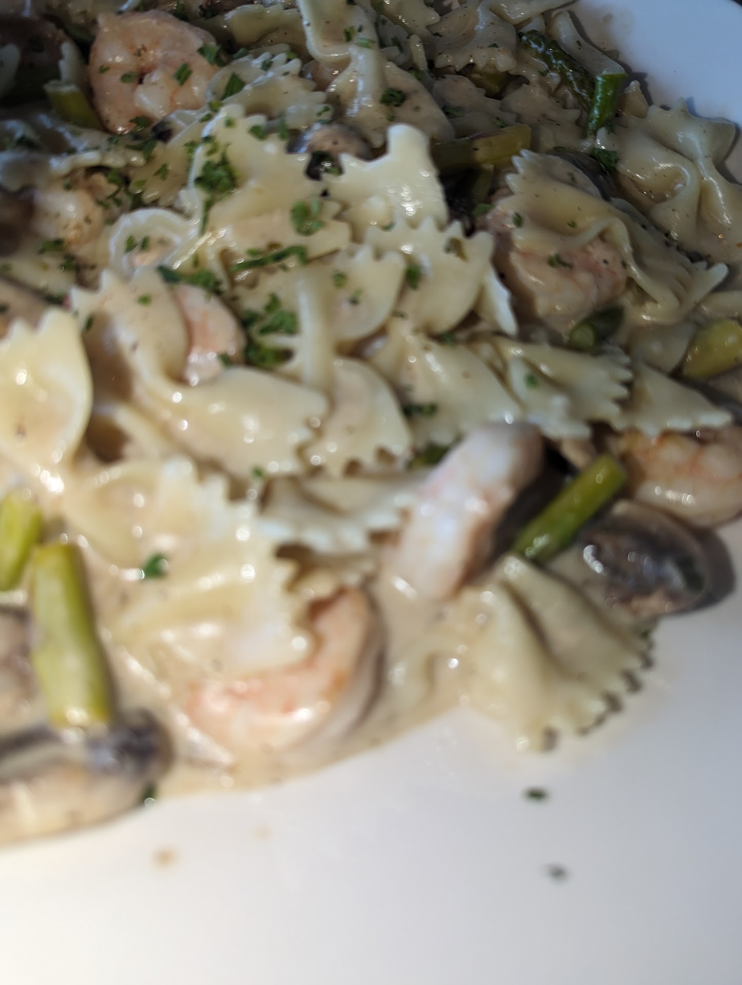 The crab dip though did arrive fast and hot. I wish the same could have been said about my sides. I ordered the Pina Colada Shrimp with mash potatoes and fries and hubby ordered the Jerk Chicken Pasta. I never could get him to tell me what was wrong about his lunch as he pretty much threw half of it away once we left the restaurant. I can tell you what was wrong with mine: while the Shrimp were hot & delectable, the mashers & fries were both lukewarm, if that. I ate a few of the Shrimp with hubby consuming 1/4 of his pasta before both of us were full. I left most my of fries but took a few to give to our dogs.