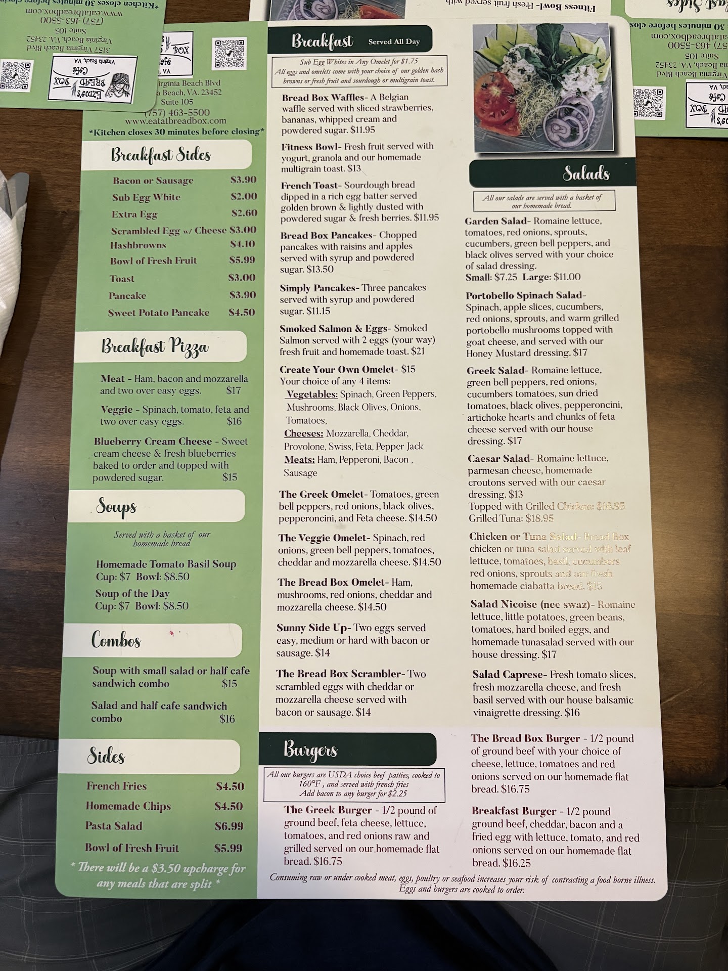 Holy hell. Avoid at all cost We are in from Cali, looking for a good breakfast. Had promise from the reviews, left pissed off. Hash browns 1. Are not hashbrowns, they are homefries. 2. Those were so over fries my husband had to stab at them 4 to 5 times showing me. 3. Literal left a pool of oil under them. Next his eggs, barely cooked to scramble swimming in oil Now on to my breakfast. My fresh fruit showed up covered in powder sugar, negating the healthy sugars and muting those berries flavor. My cheese came with an omelette. Yes I wrote that correctly. I was able to pull a 2inch by an inch chunk off of the omelette. That still left me with the correct portion of cheese to omelette. My husband has years of working in restaurants, he is picky about service. The service was horrid. One waitress was wearing so much perfume that all I could taste was the chemicals of scent. The main waitress, when we were paying finally asked how it was. My husband started with my omelette, didn't even get his sentence finished concerning my cheese. "That is how we do it." So feedback from customers is met with hostility. One more thing, as a baker my self and a cook, you would think a place would have breads on the menu if your going to call yourself the bread box. Or at a minimum a quiche to showcase you actually bake and can create from the post days breads. Or even a bread pudding if stalking bread and pouring an omelette over it is too difficult. Honestly its not that hard to do a...