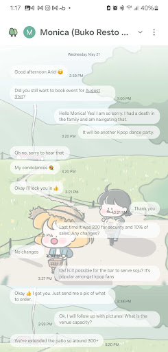 Of course, I inquired why they couldn't contact the party that recently booked and inform them of the mix up to which Leya said, âwe canât cancel them without speaking with the owner.â So how did the K-pop event get cancelled?? It was CRICKETS! After much back and forth, we found out it was a family friend who booked and thatâs why they were giving us the run around!