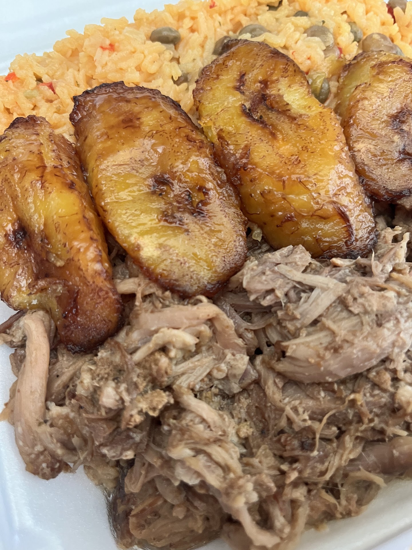 I got the pollo asado combo with yellow rice and pigeon peas, plus fried sweet plantains for my husband. For me? I had the pernil combo, same sidesāand yes, it hit every note.