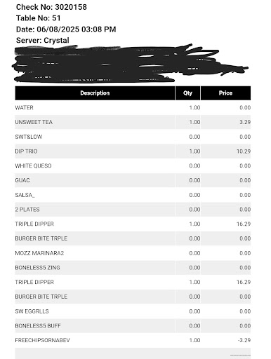 Huge side note, the food runner was an excellent employee. They were nice, friendly, jovial even and smiled at every person they delivered to. Give that...