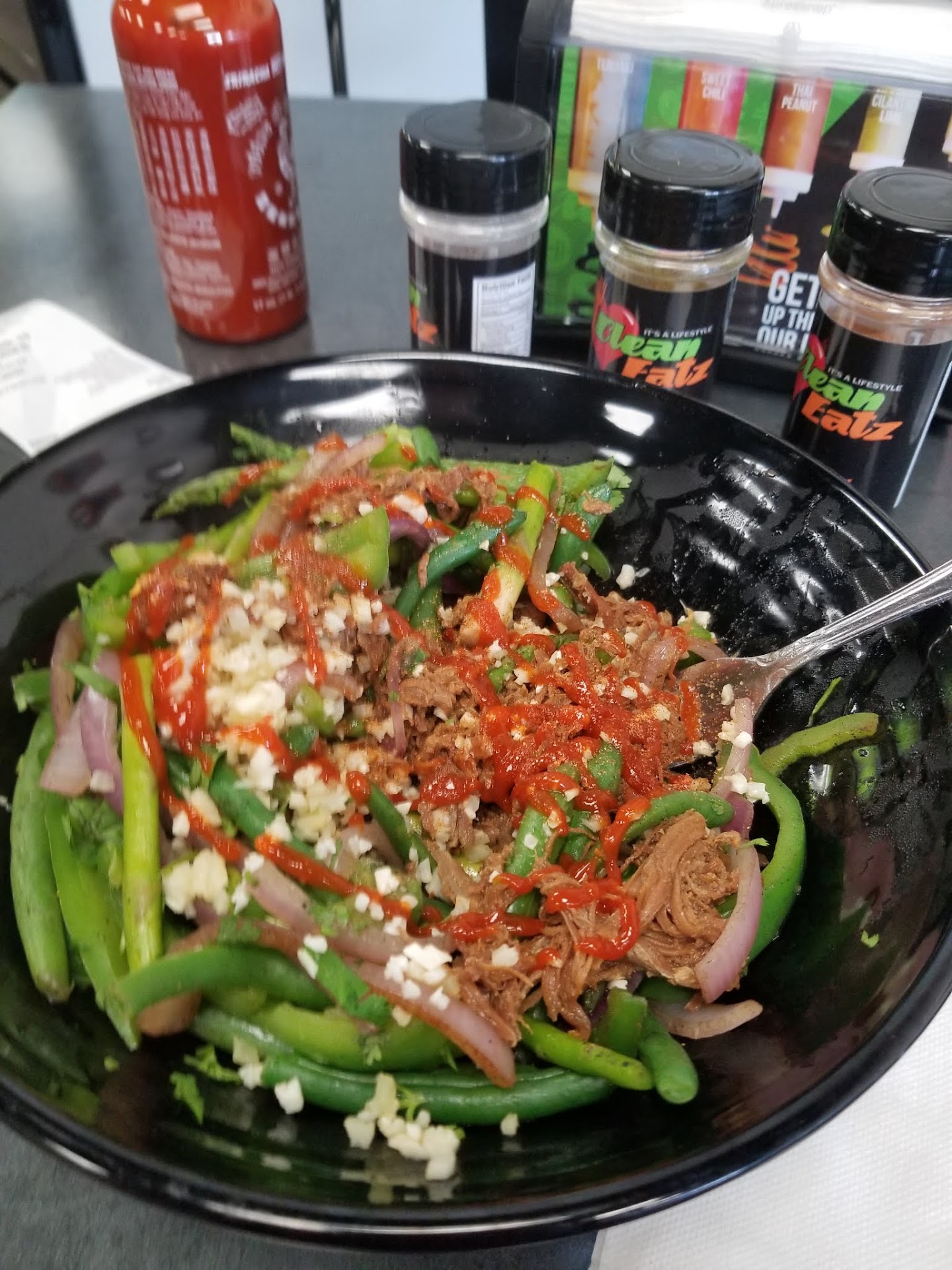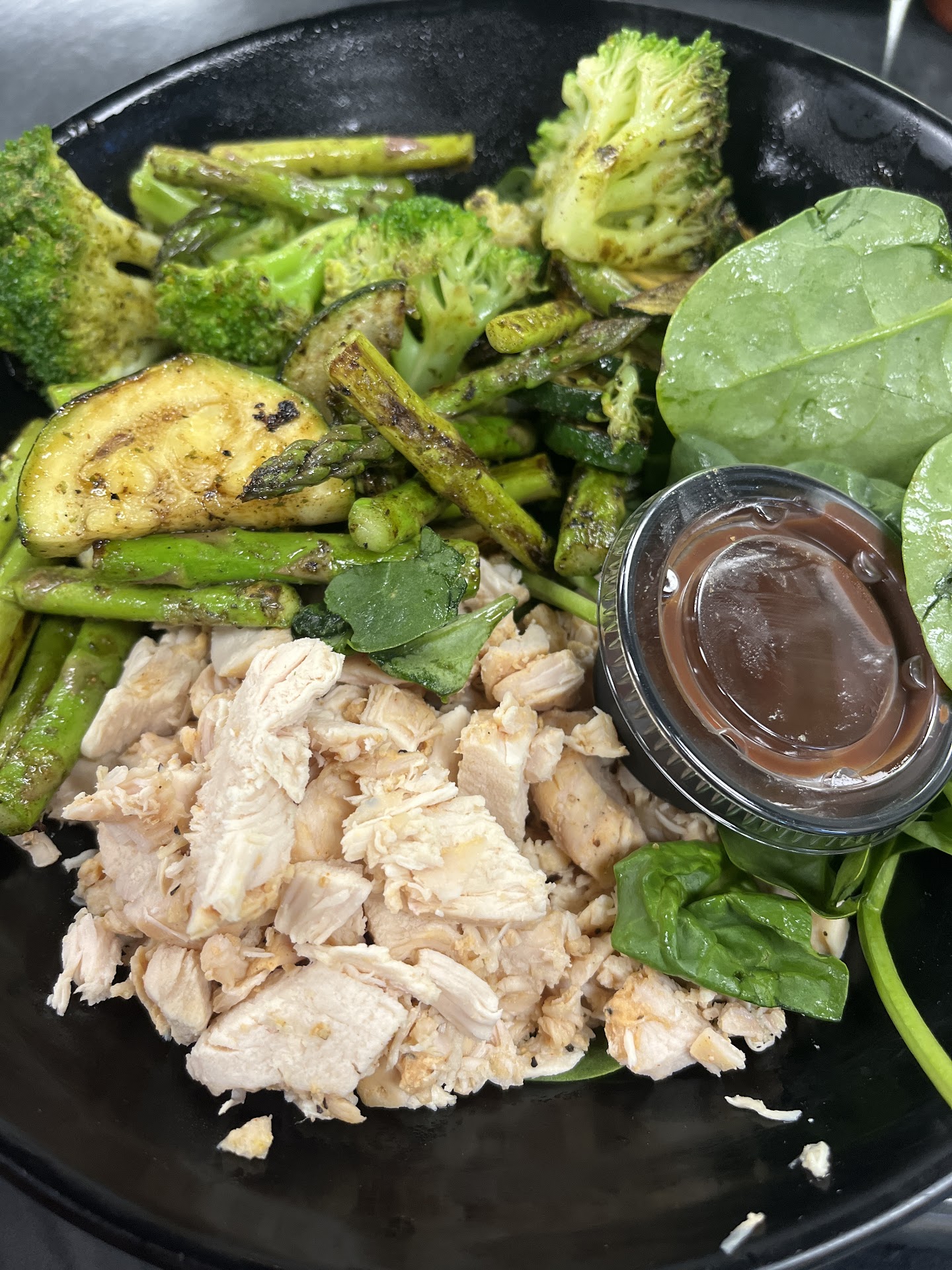 For the bowls, there are 3 things you can choose: #1: I've tried with the base of potatoes & also quinoa & kale - good, but hardly got much at all---couple bites? Will try again & see if mgmt fixed this issue - appreciate that! #2: Protein & always get their shrimp which is chargrilled perfection. Got plenty. #3: Veggies & I get mushrooms, zucchini, & asparagus - delicious, but again, hardly got much at all - pls add more! Will try again & see if mgmt fixed this issue - appreciate that! Sauce: I like to get the sweet chili sauce on the side, which is really good and not spicy.