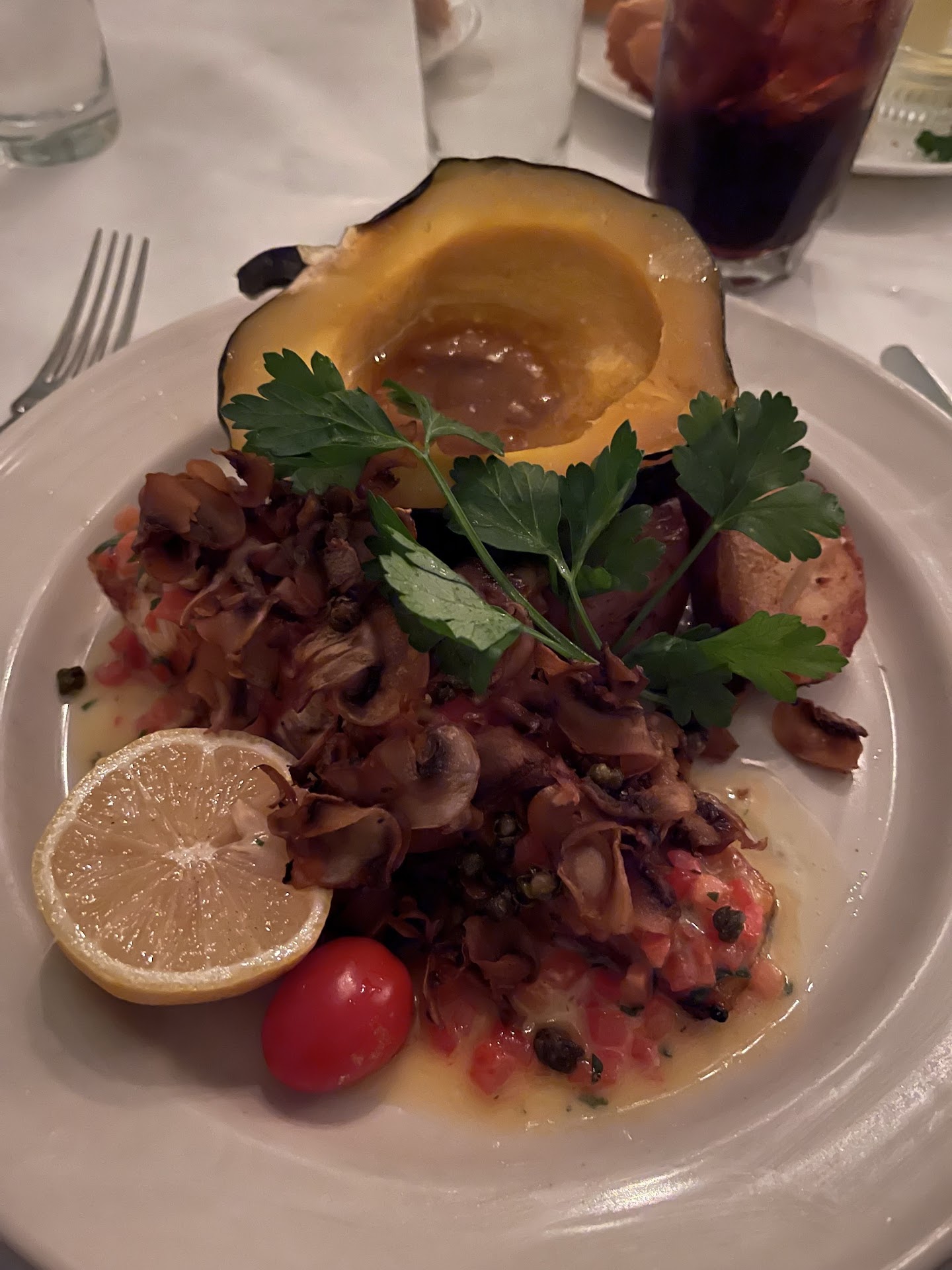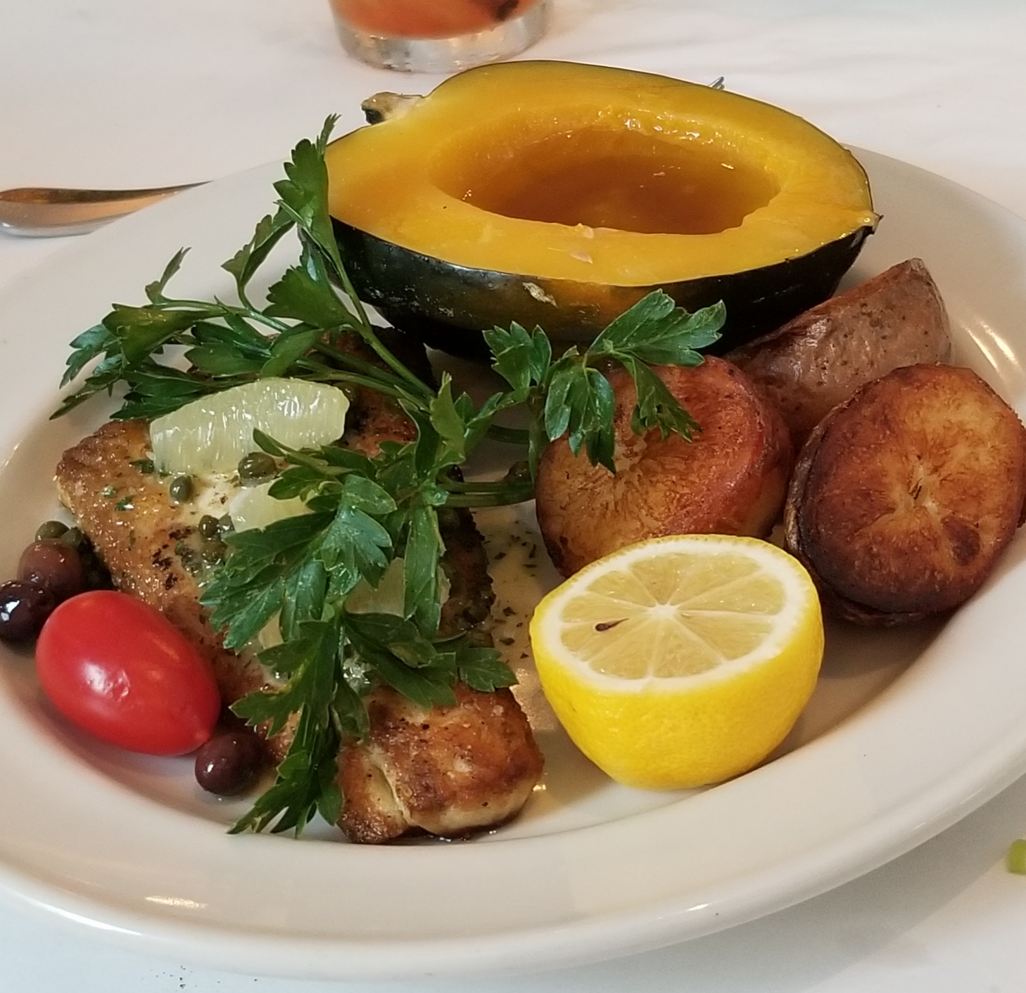Portions, tiny! With the exception of the whole bronzino fish, the fish portions on the other dishes were very small. Not certain the rockfish or the flounder exceeded 2 oz. The trout, with head and tail in tack didn't even look like a keeper. All served with a side of 3 halves of baby, baby roasted red potatoes (I think the 3 pieces combined may have been smaller than a golf ball). While tasty, the ridiculous small quantity became the joke of the night. Even my favorite, the grilled avocado with balsamic was a disappointment. The fried calamari would have been lackluster if it weren't for the little cute fun snappy sweet peppers, which the waitress happily offered up and brought us extra peppers.