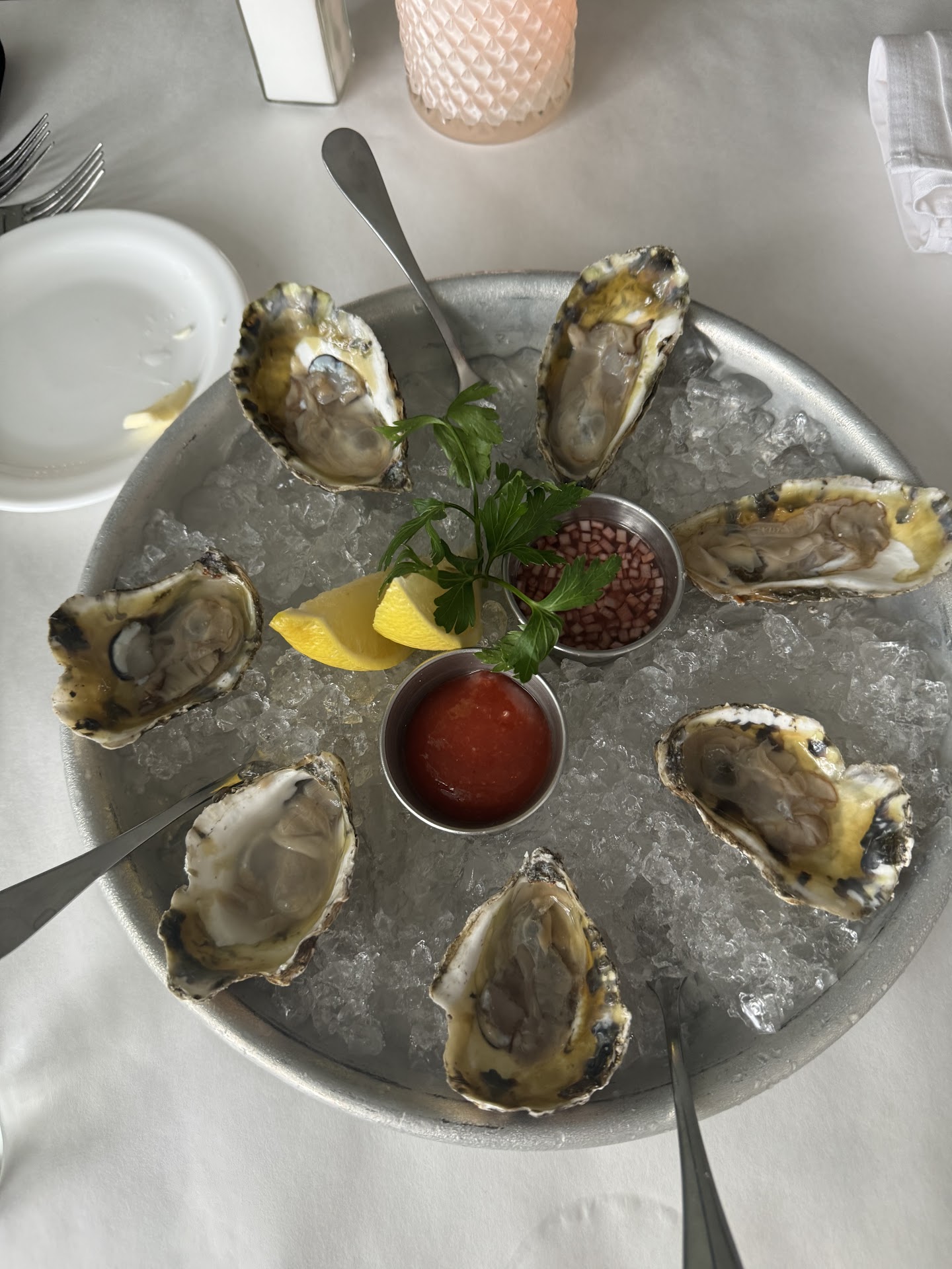 We went to Coastal Grill on a Monday evening for our 30th anniversary. Although we didn’t make reservations, they are recommended. We arrived around 5:30 and it was almost empty except for the bar area. By 6pm, the dining room was almost full. The restaurant is very pretty inside and out. It is nice to see real linens on the tables and cloth napkins. There is a very peaceful ambiance in the restaurant that is disrupted by the hostess and servers who hang out by the entrance/bar area and chat. The hostess is very animated and we couldn’t help but look her way whenever she flailed her arms (which was frequently) like something had happened. Seemed a bit immature. We found our server friendly yet inattentive. It is very impressive that the servers learn all of the specials each day and can recite and explain them. Our server said a cornsquash, instead of acorn squash so we expected a casserole of corn and squash! When we were served a half of “acorn” squash, we chuckled. A loaf of warm bread came out at some point early on but when it was gone we were never offered more bread. We started with raw oysters and oysters Rockefeller. Both were very tasty but lacked the brine of fresh shucked oysters so I wondered if they were purchased pasteurized and then served on the half shell. My husband had scallops and I ordered the grouper with eggplant purée. Both of our entrees were served with a half of an acorn squash and roasted red potatoes. My husband and I agreed that the scallops were the best we have ever tasted anywhere! They were pan seared perfectly. Dry and a bit crispy on the outside but moist, succulent and tender inside. The acorn squash was cooked to perfection as well and looked beautiful on our plates. It was a perfect side for the scallops and the grouper. Normally, we would say roasted potatoes are a fine side as well but beside the squash, the potatoes were just an extra starch and seemed out of place. We didn’t eat them. It would have been nice to have a non starchy vegetable, something green. There was one cherry tomato on each plate, a garnish maybe? My grouper wasn’t nearly as impressive as the scallops. It had rolled up while cooking, most likely because the skin was not prepped accurately. There was a bite size piece and a fist size piece on my plate. The eggplant sauce that it was served atop was a bit sweet but there was so little on the plate, I couldn’t tell you whether I liked it or not. The small bite of grouper was very tasty and succulent but the larger piece was tough and I wasn’t sure it was completely cooked so I took it home and cooked it a bit more the next day for lunch and it was very good. Overall, we both desired something with acid to counter balance the rich and creamy sweet flavors on our plates. They did serve a small garnish of delicious pickled onions with the Rockefeller oysters and my grouper which my husband and I gobbled up! It wasn’t enough though and the meal really, really needed a salad with vinaigrette or a green vegetable with an acidic dressing. With finer restaurants, we do have higher expectations for well balanced plates. We both drank water only, our bill was just under $100.00 and we tipped $20 bucks. So, we definitely only spend that much on dinner for two on our anniversaries. I know some reviews have said the food is overpriced but that is almost the exact amount we spent at an Oceanfront restaurant for our previous anniversary. (Although we had wine and dessert that year which added about $35 more to the bill) So I think the prices are very fair and similar to fine dining and fresh seafood elsewhere...
