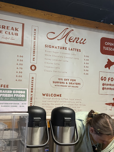 Read moreAs a VB local, I love coming to Daybreak! The energy here is so welcoming and friendly. I have been here a few times and have never had an issue with the staff. One of the baristas Hope is especially kind and makes the best small talk! She’s also very knowledgeable and has been able to answer any questions I have about Daybreaks coffee! All around great staff with great, affordable coffee. With the affordability of Daybreak and its welcoming atmosphere, Daybreak makes it high on my list for coffee in the 757 and I would...