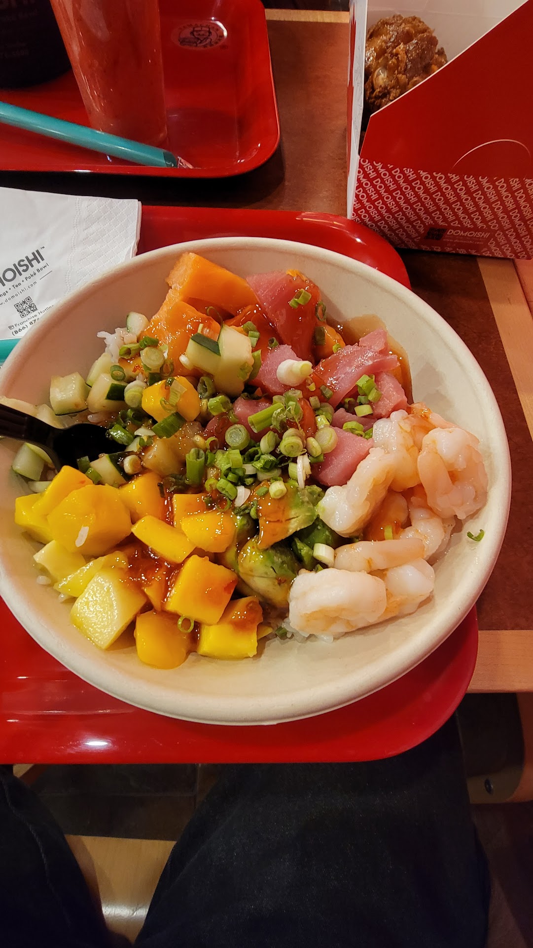 I eat here every day. My husband even started eating here most of his take out orders. I love that I’m eating healthier and the employees make the food right in front of me, so I always know my food is not messed with and it’s fresh. I get the poke bowl with doing salad mix and a lot of veggies with chicken and sometimes I switch it up with shrimp. I get avocado and mango and all my favorite flavors in one delicious salad. Even the seaweed is epic and delicious. I don’t know how or why, because I’ve hated seaweed my entire lifetime — before Domoishi! My husband gets the beef and onion and broccoli udon ramen bowl with pork base. He loves it and makes yummy noises all the while eating it, which is never how he normally eats. They are on point and we have loved everything we have ordered there, to include shrimp tempura, shrink dumplings things that were round with a light breading, and spring rolls. Tonight also got a mango smoothie that I am super thrilled I’d made with only mango, water, and ice! I have a lot of allergies and this place is an absolute blessing to me. I get to enjoy eating for the first time in many, many years, and I am not suffering after eating. Can’t thank these...