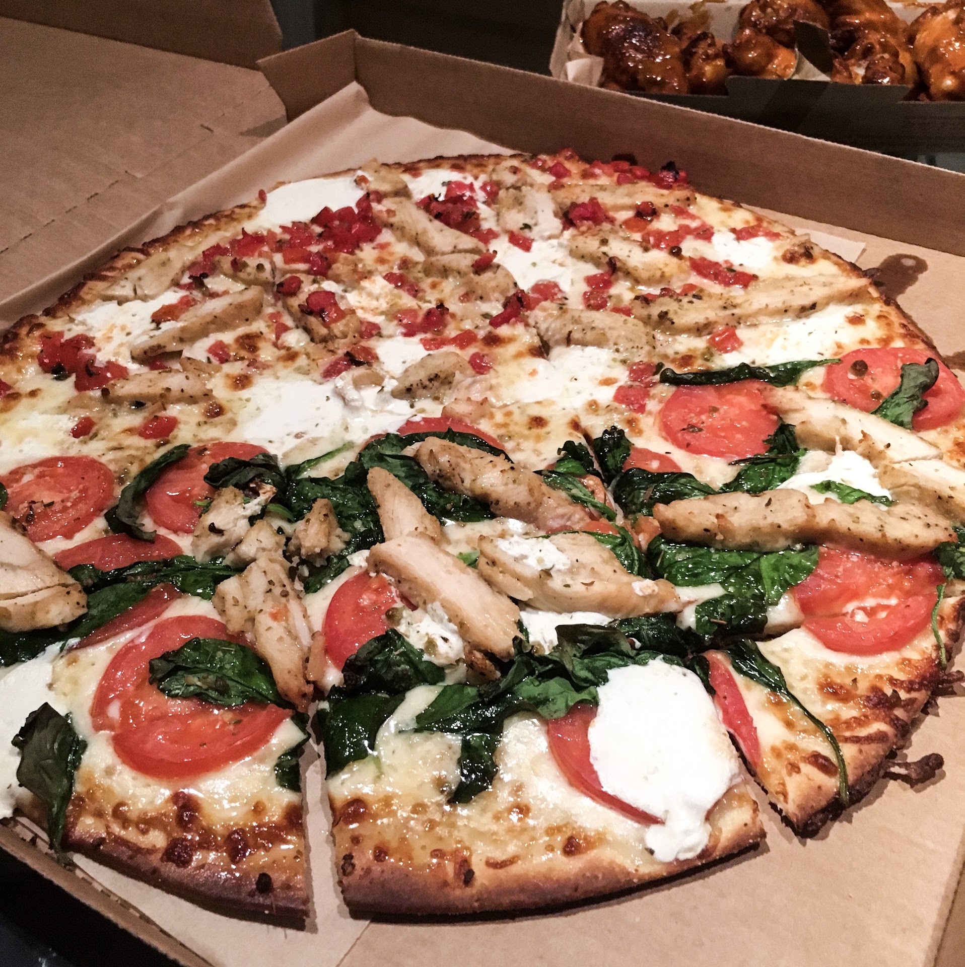 We came with my husband 20 min before closing for take out, the guy who placed our order was very patient. He told us how they are making their pizzas, whatâs the difference, what kind of pizzas we usually like. Menu is big, so we could use some help to decide) I couldnât choose between two pizzas, so he offered to make half and half, and it was amazing decision) We got half Chicken Spinach Mozzarella and another half was some other kind of chicken, but o donât see it in online menu. Anyway, it was delicious. And you could see that veggies were fresh cut, which is not so often with other pizza places) Now I know the difference!)) Atmosphere inside is so cute as wellđ So, I believe we will come back there to dine in one day)!