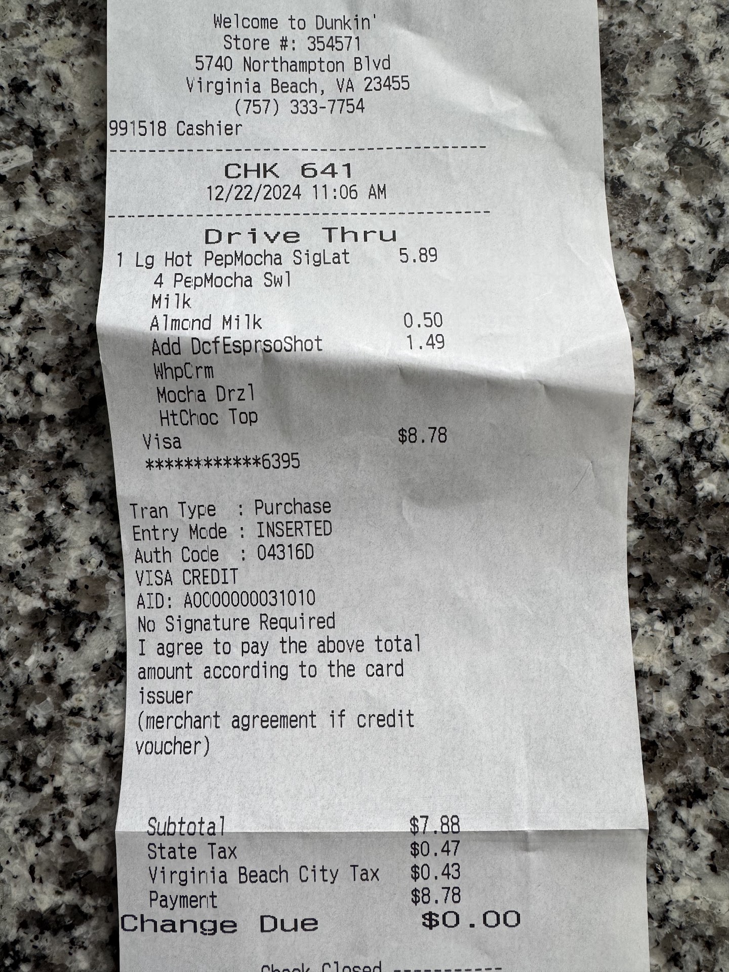 This Dunkinâ Donuts is definitely going downhill and I will not be returning! Went in this morning and ordered an iced coffee with three wake up wraps, now keep in mind I go to Dunkinâ Donuts a lot and get these wraps they have always had two pieces of bacon in them, this morning all three only have one piece in them and I ended up having to park my car and go in because they never put butter pecan in my ice coffee! Not to mention when I got to the window that said I owed 17+ dollars and they almost charge my card for all of that until I asked them to verify the amount in which it was wrong! Not feeling very confident at this point that my drink has Splenda in it instead of real sugar! Iâve also never come to an issue with the place not being able to accommodate me with no bread/buns and when I asked for no wrap this morning they were unable to accommodate me Saying there was no way they could not put the wrap on there due to only having bags. After all of this I called, and wasnât offer an apology at all, in fact I asked for a manager and got no manager and was told that all of this was normal. Will...
