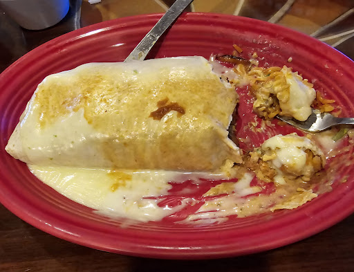 Once coming inside, the place looks bigger than it does from the outside. There were some others in there, but it took them a few minutes to even seat us. Once we were seated, we were able to take a look at the menus and also get some drinks. Chips, Salsa and White Sauce were also brought to the table. After having some time to look over the menu, we decided to first get an appetizer, which was the El Potrillo Dip. Once that came out, we were ready to order the entrees. I decided to go with the Fajita Burrito with Chicken, but not having the tortilla. My mom got the Fajita Burrito with steak.