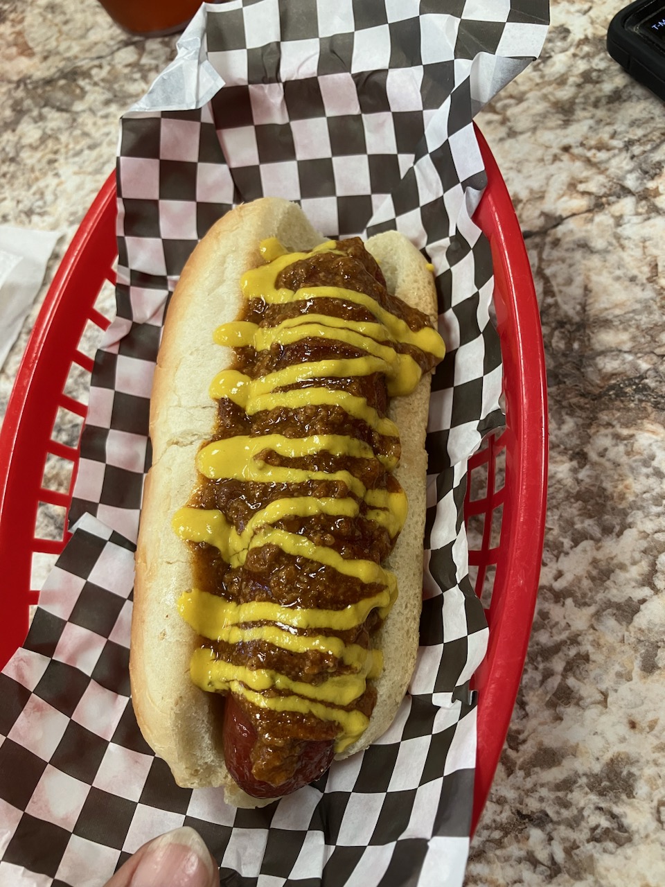 Young lady who works there is very nice and accommodating. Chili and hot dog were cold and fries tasted burnt. Worst part that is an absolute flaw of this place.... Its dirty and the nice young lady who gets you your drinks, makes your food and does all of the prep work DOES NOT WASH HER HANDS OR WEAR GLOVES! I watched her touch the screen to cash out a customer, take money from the customer, grab fries with her hands out of the bag to put in the fry basket, grab the bun for the hot dog, pick up something off the floor twice, touch a knife for prepping vegetables, touch an onion, touch a tomato, grab bacon with her bare hands, grab a hot dog and put it on the grill with her bare hands, grab an ice scoop, pull her hair back and touch many other things throughout the store without washing her hands once. The salt and pepper shakers, ketchup and mustard bottles and malt vinegar bottles are all sticky and never been wiped off. The oil for the fries were smoking because the oil has probably never been changed and the vents above the grill and fries were filthy. Not to mention that the floors behind the counter and in the dining area look like they have never been scrubbed. Please food safety and sanitation are not a priority here and absolutely should be obviously and I hope the health department comes to pay you all a visit and at least help you get back up to standards. Never eating...