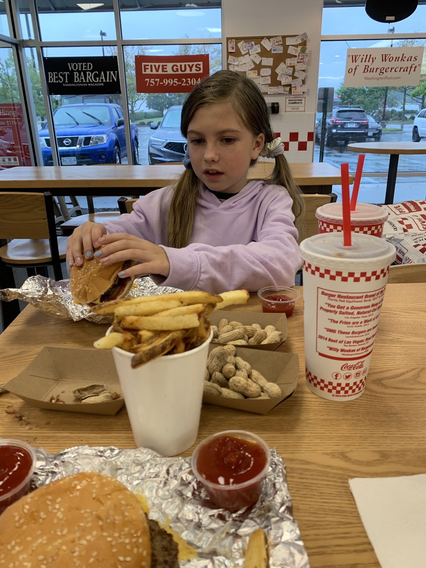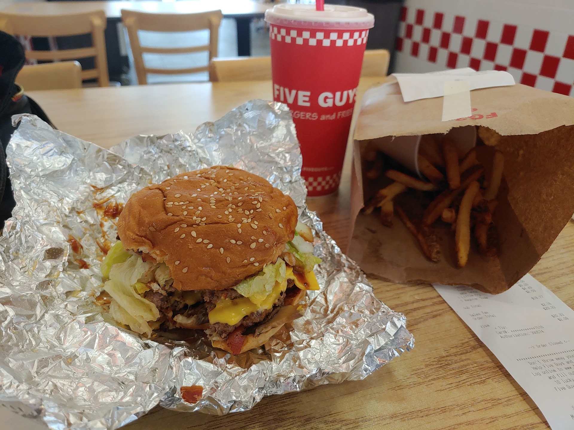 Coming in, the restaurant was pretty clean. When you go by the counter, the huge box of peanuts were open and ready for you to pick up from. My wife ordered first and asked if they still do lettuce wraps for the burger instead of a bun. She got asked if it was for dietary reasons or preference... I don't believe this was asked before unless they've been doing it for a few years now. Again, it's been a while since I've been to a Five Guys location. Anyway, I ordered the same thing. For two lettuce wrapped burger meal (shared fries and two regular drinks), the total came out to be more than $40. Okay, I don't mind since I know they usually give a huge burger and two handful fries. But the thing I did mind was the weird vibe that the employee had when we asked for lettuce wraps. I felt like she was judging us a little.