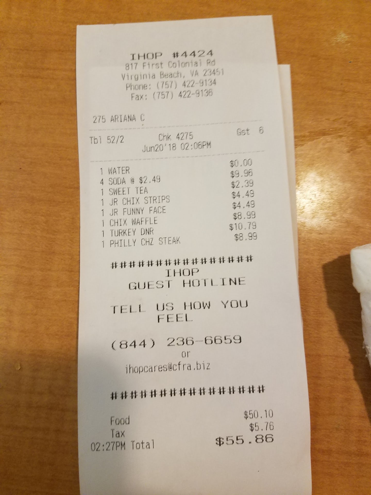 So my 2 kids, my friends and her son , and I went to eat at this establishment todayand didn't have a good experience at all! 1st let me say this I was a waitress for several years rarely did my customers have to ask for anything! In fact I prided myself on making sure I gave the service I wanted! So our waitress Kerry greeted us quickly (they weren't busy so no reason she shouldn't have) and took our drink orders wrote them repeated it back as we said it then got 2 out of 5 wrong. When fixing the problem wrote it again and still got them wrong! We placed our orders me not a pork eater specifically said a side of turkey sausage twice then before she walked away asked if she got my TURKEY SAUSAGE she said she did. We waited forever in this not very busy establishment for our food to come I ordered a big steak omelette. I did as it's what I always get when going to IHOP because its always filling and has plenty of the ingredients you don't have to ask for extras boy was I disappointed all I tasted was egg and hashbrowns! I bit into what was supposed to be turkey sausage and it was pork. Unsure if I was wrong (maybe its the brand) I aasked my friend to taste it she agreed it was pork so I pushed it aside complaining because its been 15 1/2 years since I have had pork and I didn't want to be sick. We continued to eat our food though we were all a bit disappointed no flavor or wrong food. When the waitress finally came back we asked about the sausage and sure enough PORK! She fixed that problem and asked about refills. 1st off if we empty and still eating of course you shouldn't have to ask and 2nd she brought wrong drinks again! Now we are all a bit upset but trying to refrain from getting ignorant so we ask for boxes when she comes back. She brings tiny boxes which would only work for the omelette so we ask for something bigger for the pancakes in the mean times we are having to run back and forth to the restroom because we are all beginning to feel sick. She leaves the check and upon looking at it there is extra stuff on it. Another waitress we didn't get her name asked if she could help us so she took the check to fix it. She didn't come back but our waitress did showed the receipt fixed and walked away, but didn't hand it to us so we could pay. All our plates were empty and sitting neatly in piles along with several drink cups (again I was a server so I tidy up before leaving) After waiting another 20 minutes and refraining from becoming ignorant I pleasantly asked to have the manager come to our table. I then had to go get sick in the restroom. When I rreturned my friend was explaining all the issues to the manager who seemed nice enough. She said to him she may have other things to add to which I explained I was a server for years in a super busy environment I understand good days and bad days and all that but with the little business and the amount of servers they had in there there was no excuse for it he apologized for the inconvenience and said he would give us a discount. For an almost $100 bill he took off a whopping $13.78.... Wow! Then we go to the register (my son already outside getting sick) and there are other issues arising it takes another 5-10 to get checked out. Times spent at this establishment 2 hours amount of time actually eating, drinking, conversing, and enjoying each others company 20 minutes! It was beyond ridiculous and they lucky we all were sick or there would have been a scene over the...