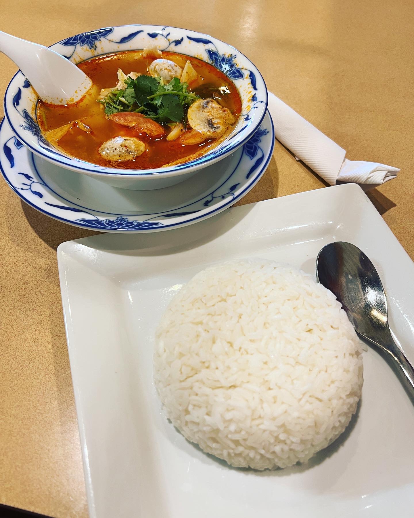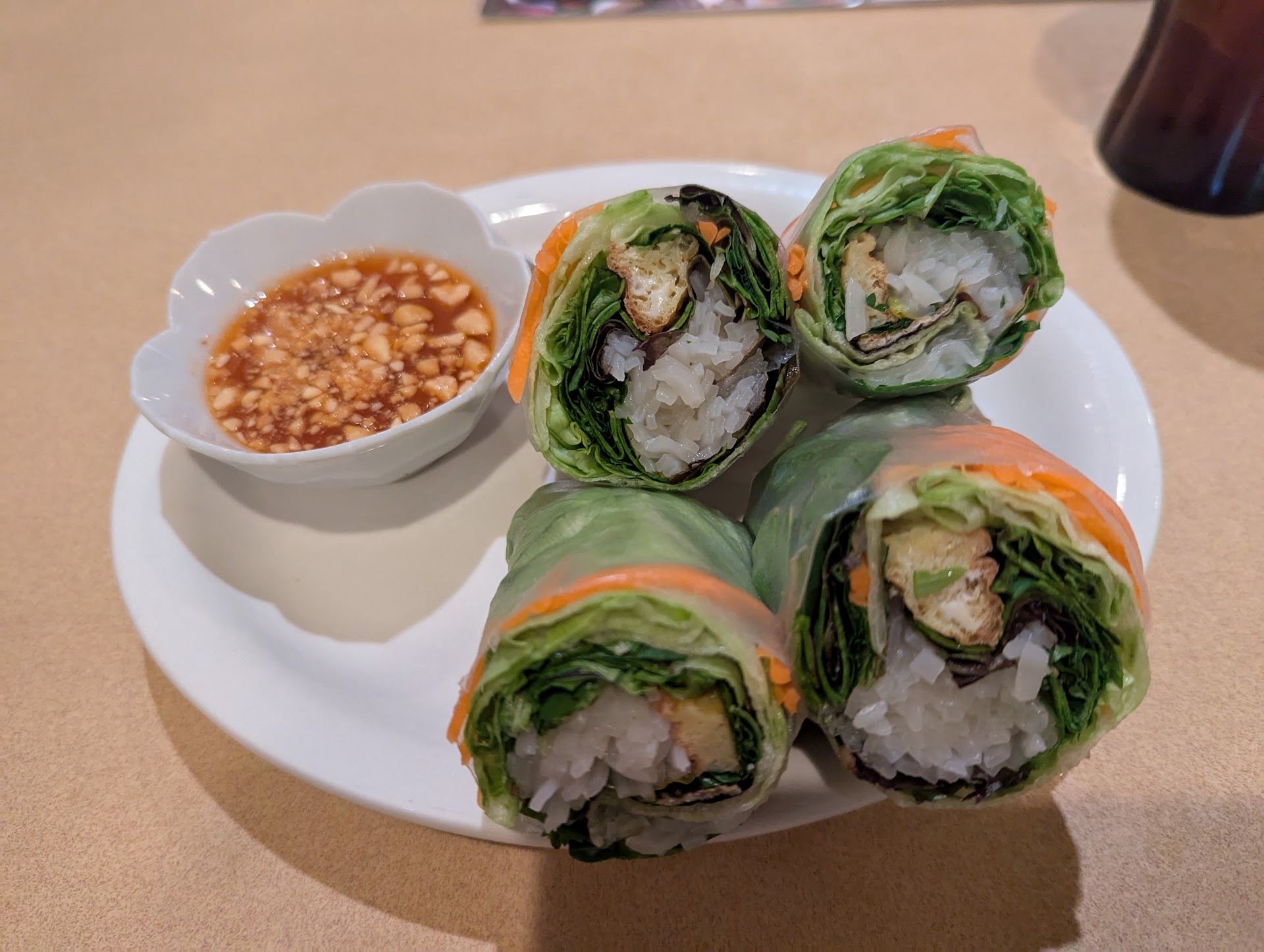 Their iced tea was awesome! Nice and strong. The fresh spring rolls were packed with greens and even a bit of cilantro or basil. They were really good and the sauce went well with them. I also ordered the woon sen soup, it was perfect! Great broth and tender chicken, the cabbage and mushrooms were fresh. I loved the white pepper sprinkled on top.