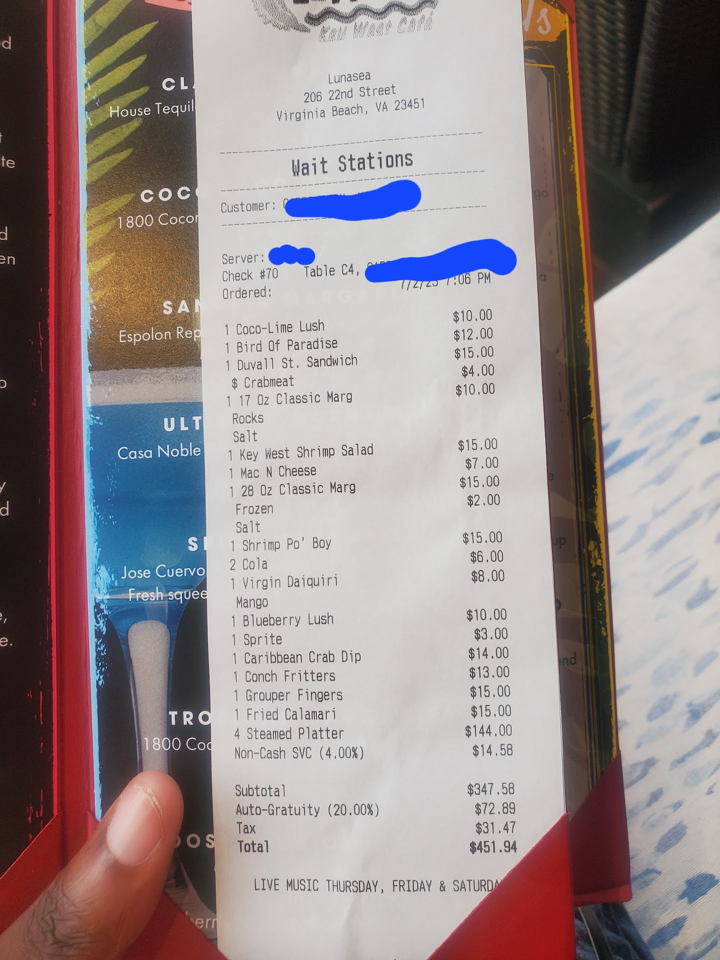 Read moreThis has to be a first in my life along with my family of 6. We decided to eat at the Lunasea during the Memorial Day holiday weekend. It started out ok. The waiter was nice, the drinks and food were ordered up with no problem. After that, it was all down hill from there. My shot of Monte Alban tequila had a small bug floating in it...The waiter took it back and the owner came back with another shot glass full of watered down liquor. The owner didn't even acknowledge that there was a bug; she just asked was I ok. Then she walked away. I just looked at my family and was like wow ok. I drank the shot an noticed that there was no kick, hence watered down liquor. I went over and asked the bartender to see the bottle that it was poured from. The bottle was about empty with a light colored liquid, not the deep gold color. The bartender then replaced the bottle of tequila with a new bottle but didn't offer a replacement for me. Horrible customer service!!!!!!!!!!! I asked to see a manager. The so called owner came out with a major attitude and said that I was ridiculous for saying that about her establishment and walked away. My wife and I were beside ourselves with the nastiness of the owner. We stopped and told the waiter that we refuse to eat but would pay for the drinks that we had. This chick called the VA Beach Police Department on me and my family like we were criminals! What criminal pays for what he drinks? 2 bike cops and two marked units show up and get position on me to try and take me down. We talking 6 officers. See I'm a cop, I know the drill/tactic. I had already sent my kids back to the hotel so they didn't have to witness the ways of the biased Department. I've lived close to the area all my life. I know how they roll! Here I am at a standoff: Don't pay and go to jail or pay and take cold food for my wife and kids. I decided I had to pay of course. So I asked the owner to redo my food. She came out with the old food jumbled up on a server tray along with to go trays!!!!!!!!!!! It took everything in me to walk away! Get this, the officers have me surrounded totally. They just knew they had a MARK! Not today, not me! Bottom line paid the bill and my family was still hungry! If you are in Virginia Beach, don't bother to eat here if you are not a local and not of the right persuasion! Yes I said it! It's sad this stuff still goes on in 2013! I am a 24 year Army Veteran and have 16 years of law enforcement and that...