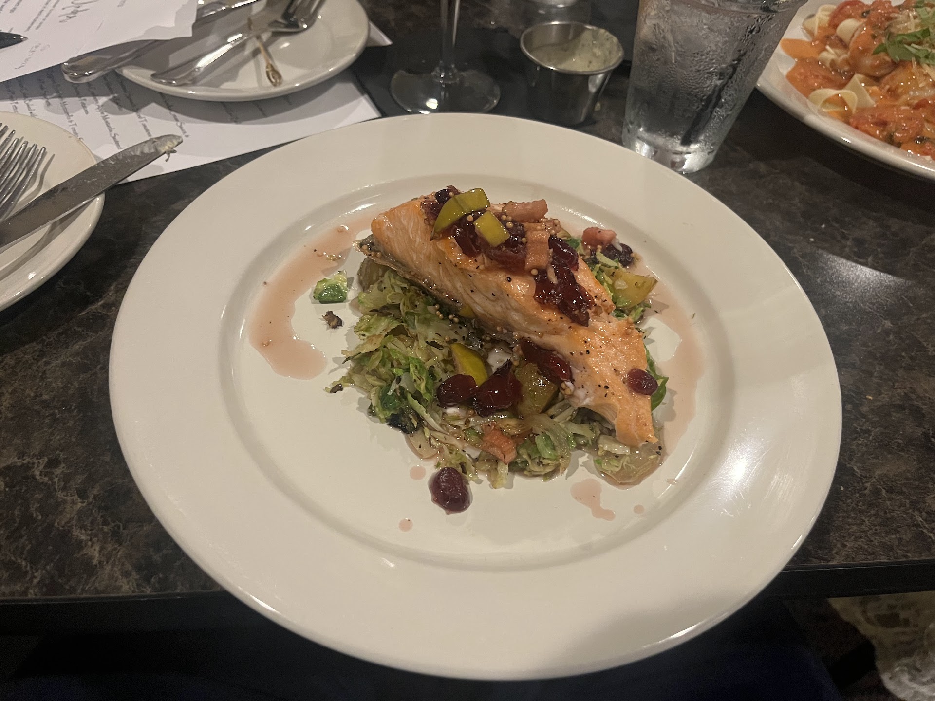 The salads were average, arriving almost an hour after our appetizers. I then realized the intent was for the food to cover the entire 3-hour span of the musical performance. I told our server that it was okay to “stack” the food to which the server replied that only two people were working in the kitchen. Having worked in the food service industry, I was surprised that he would divulge such information, but I sensed he was flustered.
