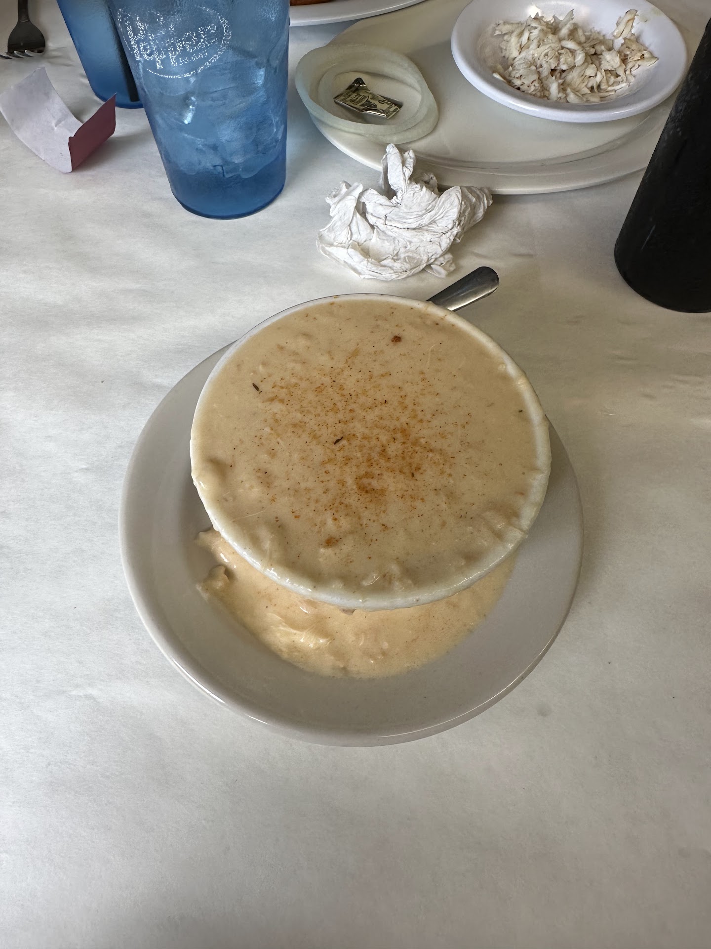 Then came the food. I am, admittedly not a seafood junkie. On the contrary, some might call me a seafood antagonist. I've struggled to enjoy it all my life and perhaps Margie & Ray's wasn't the place to try and break my predisposition to dislike seafood, but I figured that was the place to give it a shot. So, with a gaping, dripping hole in the ceiling above my head and the toilets flushing to my right, I went out on a limb and ordered the She-Crab Soup which was, according to the menu, the speciality of this crabhouse.