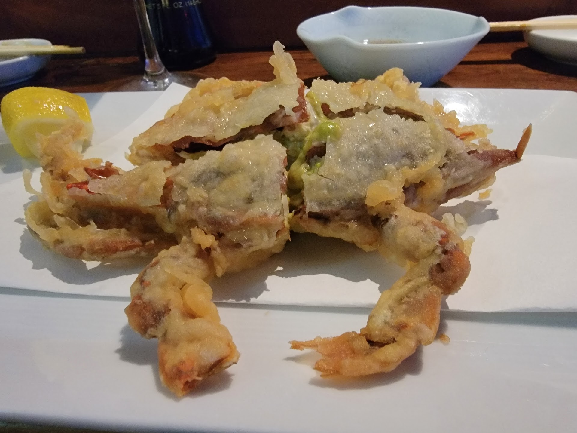Last, but the most important one, the food was delicious! You can tell that the chef cares about the ingredients they put out. Everything was fresh and the quality was not lacking at all. We had the special soft shell crab fried under tempura batter. As we put a spritz of lemon and dipped it into their tempura sauce, the flavor of the soft shell crab was complimented by the light lemon taste and the slight saltiness and sweetness of the sauce. I also ordered the salmon belly. I knew what to expect for taste because I've had it somewhere else before. With 4 big pieces of salmon belly associated with the sauce and a slight kick of spiciness, the sushi melted in my mouth. I had to order another one to end the night.