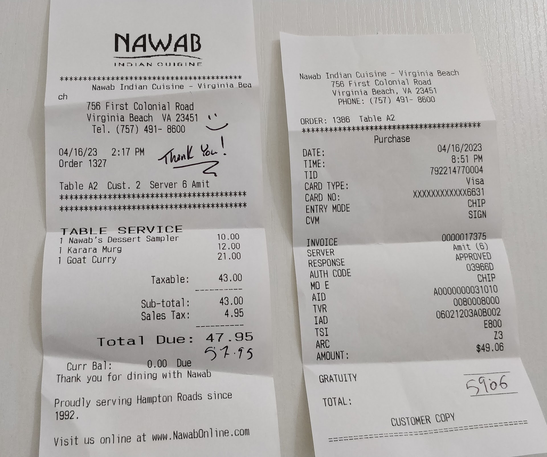 Read moreThis is my first visit to Nawab at Hilltop. I recently visited (and loved) the one on Military Hwy in Norfolk.