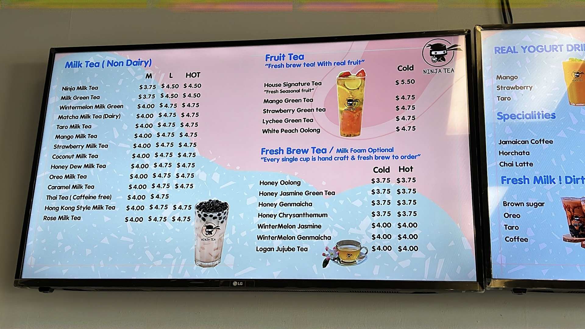 Read moreI was meeting a group of friends at Kappo Nara and Ninja Tea is a part of that establishment. When we first arrived, my son and his girlfriend were sitting in Ninja Tea, waiting for our table. My son told me to taste his Rose Milk tea because he was raving about it. It was pretty good, so he ordered a hot black tea for me. Since I'm a rookie at this, I did not realized that you can determine the amount of sweetener that is added. It took a really long time to get it, so we went and sat at our table. After 30 minutes or so, my son went to check on my order, because they typically find you in the restaurant and deliver it to your table. Even after he checked on it, it still took them another 15 minutes to bring it to me. It was sickeningly sweet, to the point where it probably sent my blood sugar sky high! I will try them again, the next time we're at Kappa Nara, however this time around, I'll be empowered with the knowledge that I can control how sweet I want my tea. I am a tea connoisseur, who appreciates fairly strong tea (preferably black), with a small amount of sugar and milk (English Style). I also want to try out one of their Boba drinks, just because I've never tried it before. They have quite a large selection of flavors from...