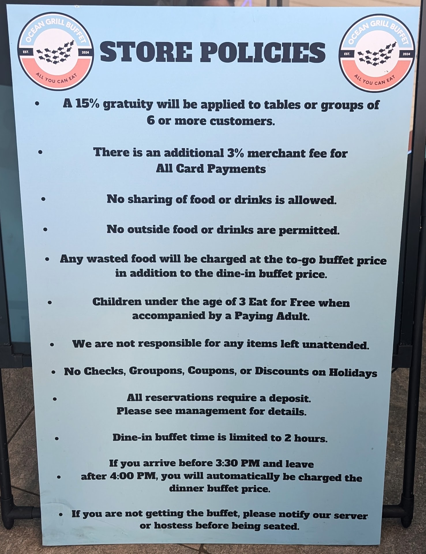 I visited Ocean Grill Buffet after seeing their advertisements for “all-you-can-eat snow crab legs” and expecting a seafood extravaganza: scallops, shrimp varieties, crab legs, oysters, clams, fried clams, and fish. Unfortunately, the experience was far from what was promised.