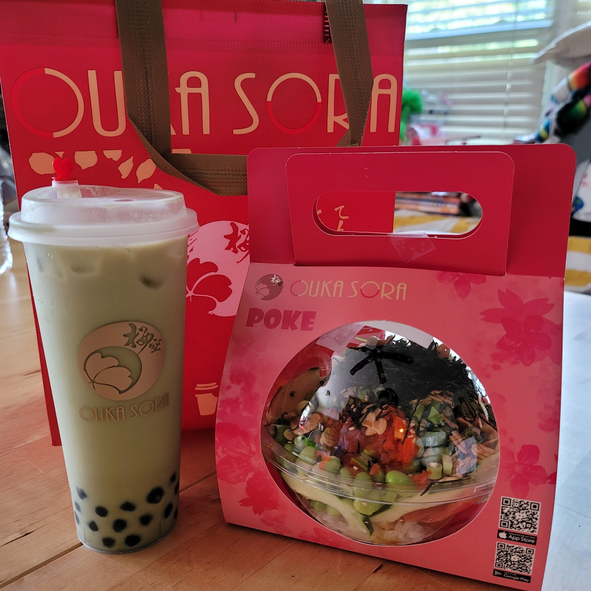 Ordered online on the Ouka Sora website. Site wasn't hard to navigate, but scrolling through all the options can take time. They have a lot of food options including poke bowls, ramen, sushi burritos, sushi tacos, and lots of appetizers. They also have a good menu of beverage drink options. I ordered a pick 2 poke bowl and a matcha milk tea. The inside of the restaurant is clean, colorful and modern. Walk in customers order on 2 tablet kiosks, which is convenient, but you may as well just order online for the same experience. My order was ready in 15 minutes and the presentation of the food and drink is awesome. My poke bowl came in an actual sphere container with a convenient holder, and my drink in a matte non-slip cup. They also had branded reusable bags. My poke bowl was delicious, packed with everything I requested and very filling. My matcha milk tea was good, but the boba was undercooked and hard to chew in some spots. I also prefer heat seal boba drink cups as opposed to lids so the drink can be shaken to mix up the boba. As cute as the little heart seal is for the drink spout, it does not provide a tight seal and my drink did leak when I tried to shake up my boba. Overall it was a great experience and definitely a good recommendation if you're looking for some poke and a...