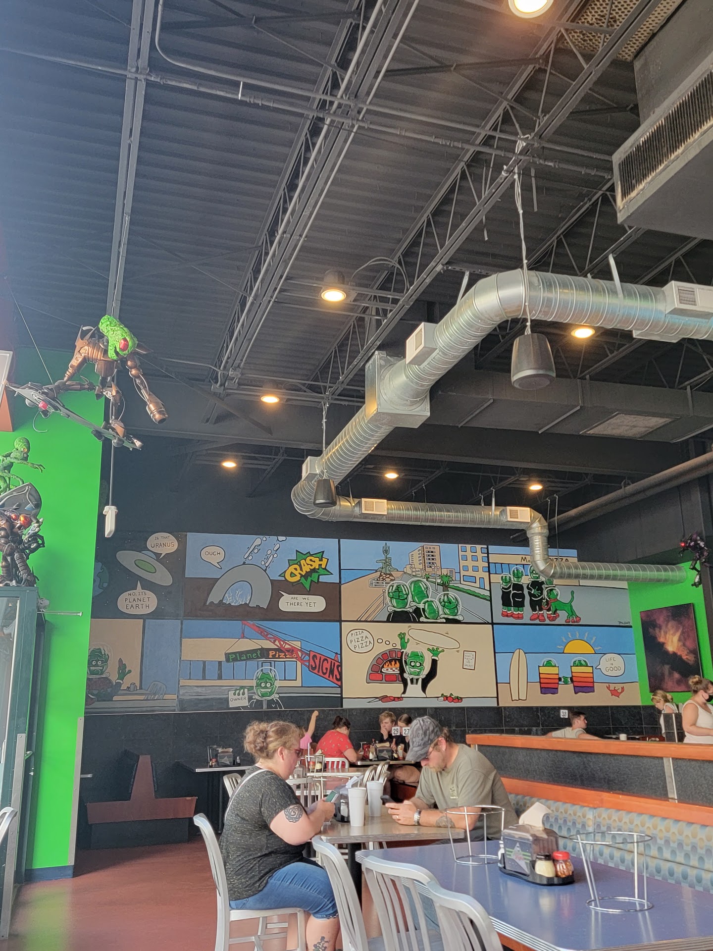 From the alien figures & pictures, this place is one of the better pizza joints at Virginia Beach oceanfront area. Located right at 9th St sign, you can't miss it. Most importantly, it's the pizza, the reason for eating here. Perfectly cooked to order, the crust is amazing. It takes skill to make a perfect crust. They say a good crust makes the pizza great! The mini (8") pizza arrived still steaming hot as you grasp a slice. The real mozzarella cheese would ooze and extend from your mouth to the slice you're holding. Impressive. Now the crust. A perfectly cooked thin style crust almost like a wafer crust at the ends. The ingredients are fresh, not canned. Like all pizzas should be. Too good to be true? Yes. Because the Soda at $2.99 offers no free refill. On a hot 90°F day, I drank it like, in a second! All kidding aside, do eat the pizza here. It...