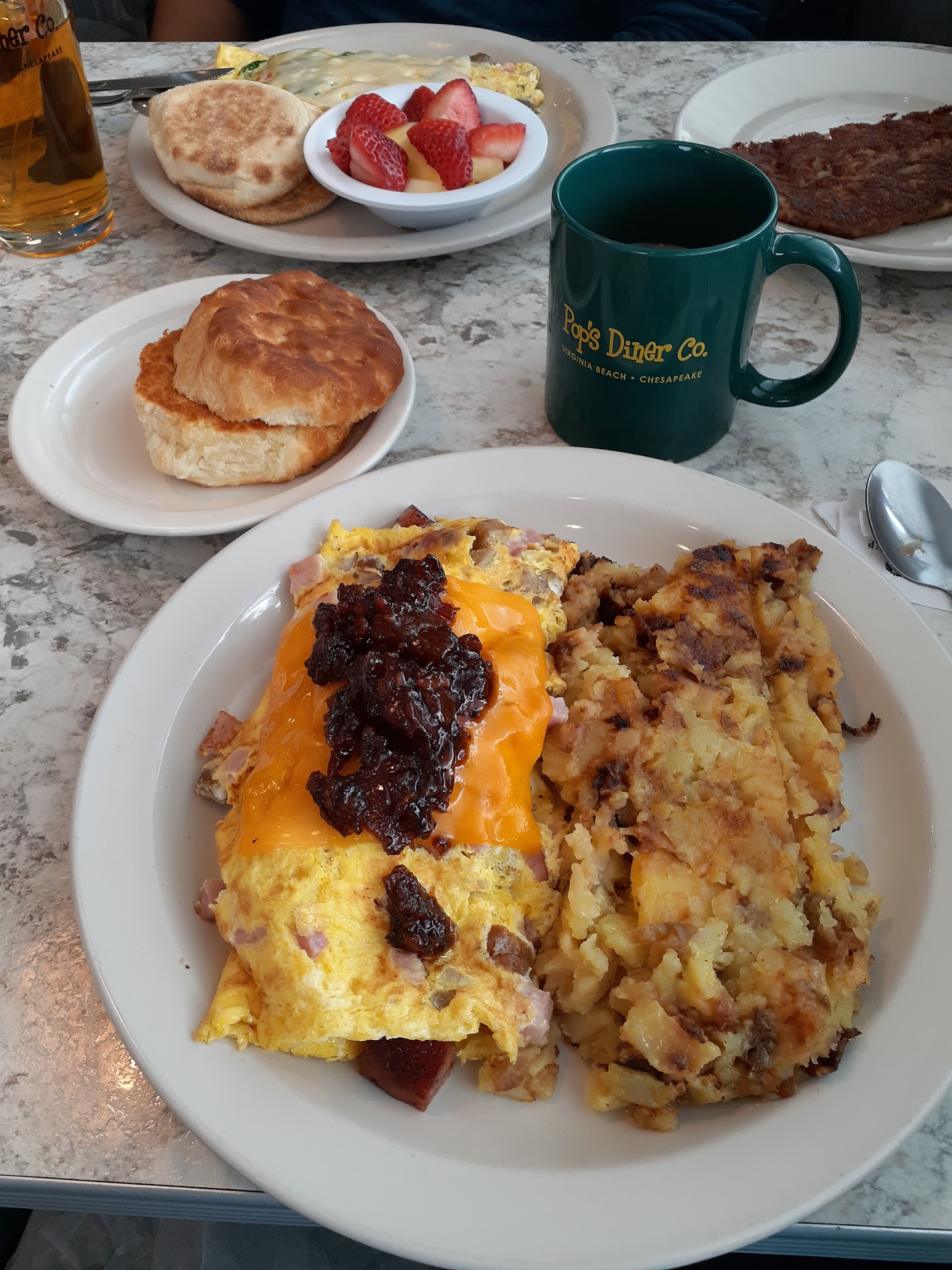 For mine, I chose the yummy Piglet Omelette because I'd never seen its ingredient combination offered anywhere else before -- a filling of kielbasa, ham, sausage and cheddar cheese with a topping of bacon jam. Then I picked their signature home fries (soft, fried potatoes with what tasted like sweet onions) as my side (the other choices being grits or fruit), and a biscuit for the "toast" option (I believe they also offer English muffins and bagels for this part of the combo, which is also unusual).