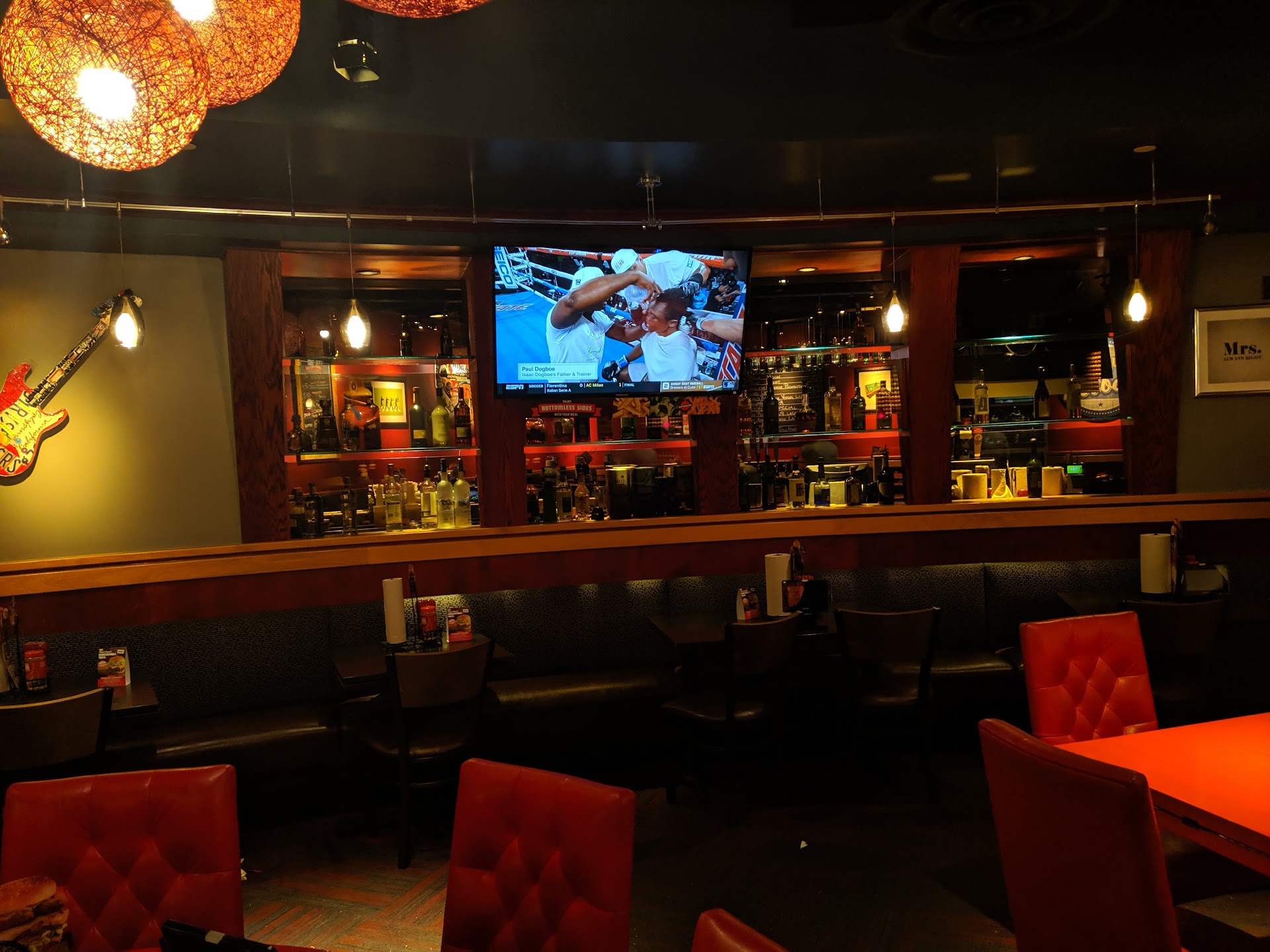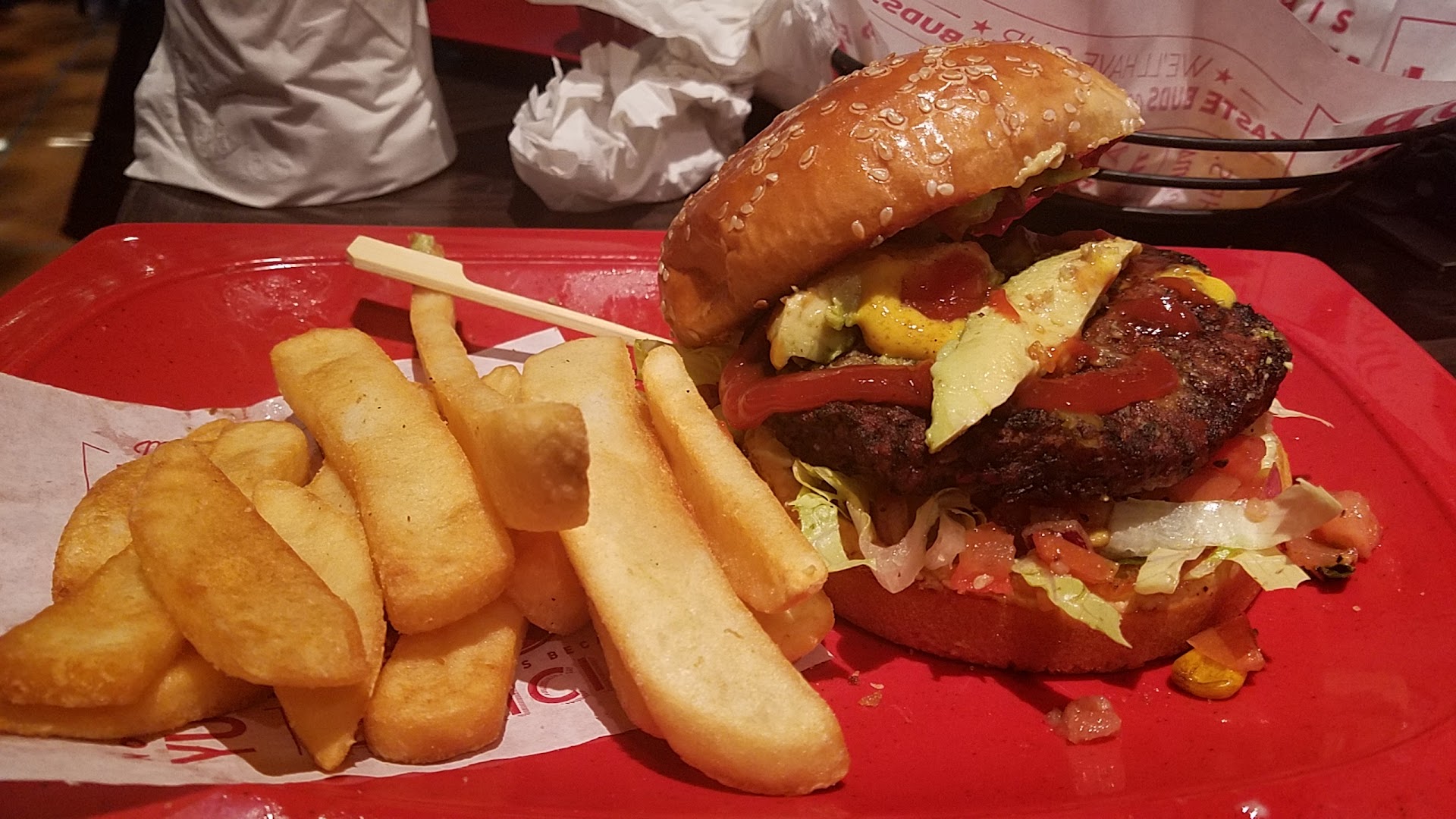 Read moreTo start we were greeted by uniformed officers and had no idea why (it was "Tip a cop day" we later found out from our server). We were offered a table in the bar area which is always fine with us but the smell of bar funk hit me IMMEDIATELY and STRONGLY. It wasn't quite the "Pine Sol cover" it was more of the "stuff has been wet and growing bacteria for too long" kind of smell. Overall the place LOOKS clean. Our server made it to the table to let us know he'd be right with us and we had non alcoholic drinks (I mention b/c the service bar was in fact swamped with one tender on shift also working too many tables) on our table in an astonishing 15 minutes (meaning it was fifteen minutes kind of a long time). Anyhoo for those of you that aren't aware Red Robin has re-invented the concept of meat temperatures with "Some pink" or "No pink". So you don't order your burger medium or well done...just one or the other and apparently you get what you get, or at least I did. Now the doneness of meat for me depends on what I am eating... for a burger I like it still hot so I always order medium to medium well so I tried to order MW but server corrected me explaining the above concept. Fearing that they would cook it beyond my liking and having no problem with a little or even "some" pink I went with "some pink". I received what seemed like a bad attempt at a Pittsburgh preparation the outside was cooked and by the time it made it to the table had joined the cool inside temperature of the rest of the burger. Clearly the cheese was melted while it was still on the grill or with a heat lamp/salamander you tell me don't know but I know the HEAT from the burger didn't melt the cheese. Nonetheless it was palatable. I didn't realize that part of their "gimmick" is endless fries which I found ironic since the fries served WITH my burger were, to use the least hyperbole, tepid or better yet...above room temperature, which did not inspire me to want more of them free or not. This was my first visit to any Red Robin and for as harsh as this review seems I will go back b/c I really want to experience what the concept tries pretty hard to be...it's corporate quick casual and I have a deep background in the industry so I understand that weekend afternoons can be tough to staff (as evidenced by one bartender oversat and trying to handle SB as well). I will order NO PINK from...