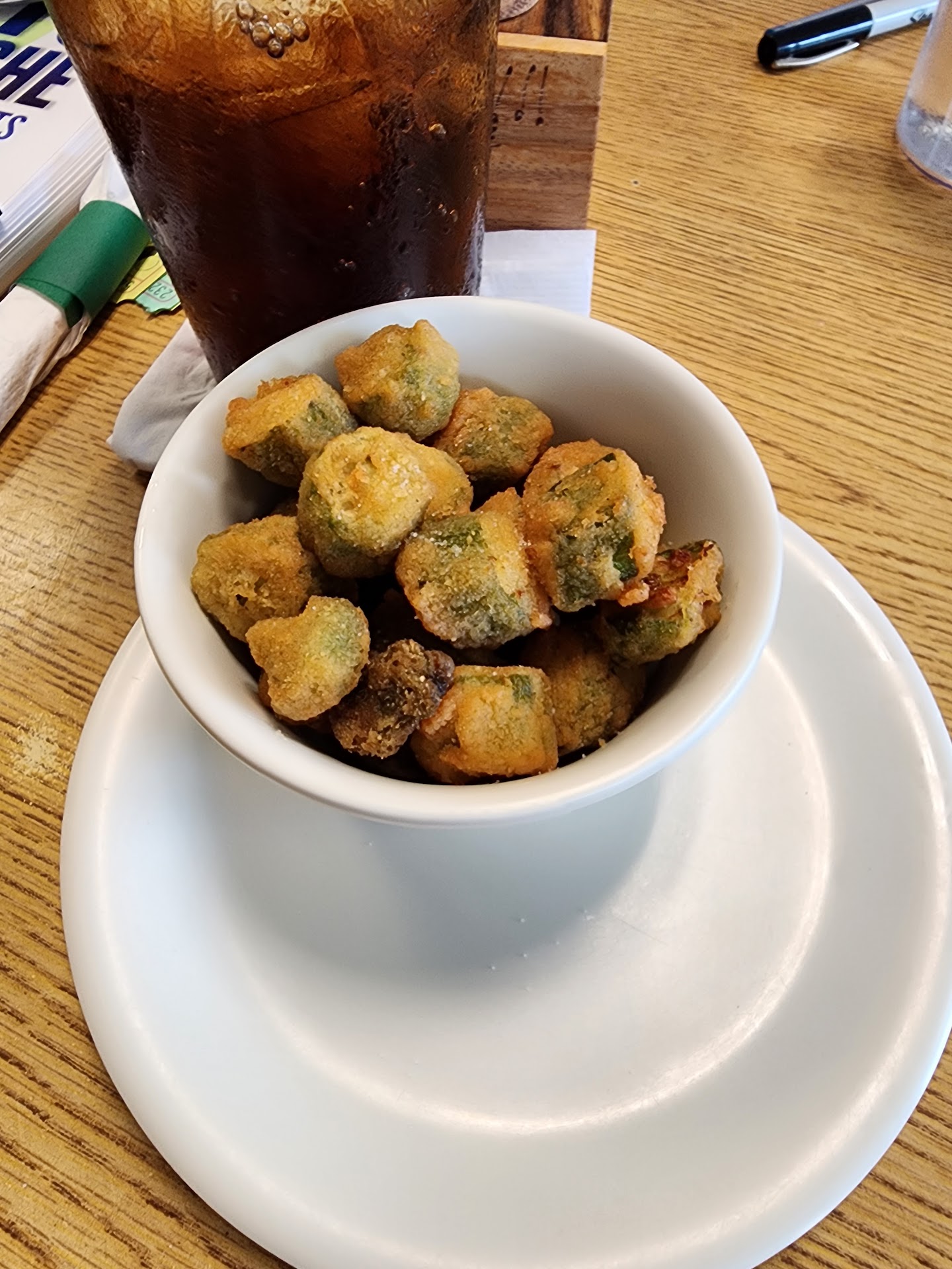 I love club sandwiches, and even though they are quite simple, Rick's was served hot, perfectly toasted, no bad ham cuts, fries crunchy on the outside but soft on the inside, onion rings that were sweet in their battered shell and fried okra that reminded me of mama's home cooked okra from my childhood memories. The only hiccup in my meal was the pie. The crust was so light that it appeared uncooked - no crispy pie shell and the apples felt too firm. Even with my dessert being a let down, I was happy enough to want to make a return visit.....and soon as they have BBQ ribs on the menu!