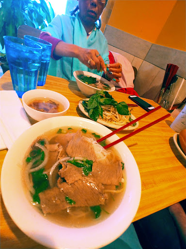 We were so impressed we went back the next day for lunch and opted for the ginger glazed salmon as well as a rice platter with pork, beef, and shrimp. The pork spring roll was great. Everything was absolutely scrumptious! Midway through the meal the owner brought over a couple of steaming bowls of pho broth that hit the spot and was a very nice added bonus - caring and thoughtful.