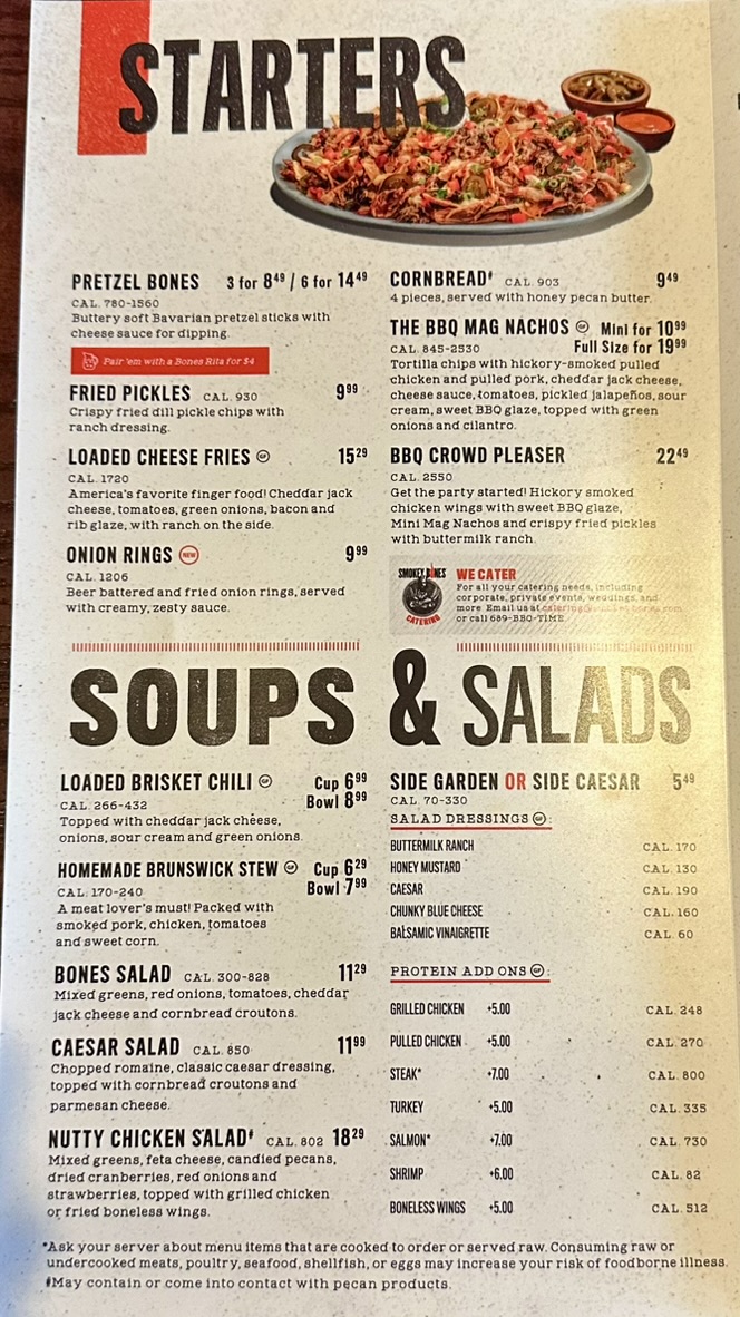My family and I decided to spend the last day of our annual trip to Hampton Roads in Virginia Beach, exploring the area and shopping. We all started getting hungry around 2:30 so we decided on an early dinner. After perusing our options on Apple Maps and Yelp, we all settled on trying out Smokey Bones. When we arrived at the building and walked in, we were greeted by a welcoming and clean atmosphere (there was even cleaning supplies left out among guests), but the staff was less than welcoming. We stood at the empty podium for what seemed like a long time. Two employees both looked in our direction then returned to what they were doing, without so much as a verbal greeting. Finally, the bartender approached the podium and asked us how many were in our party. No “hello,” “welcome,” “sorry for the wait,” nothing. She then gathered 5 menus and began to walk away without saying anything else. We assumed that we were meant to follow her, since she didn’t verbally ask us to.