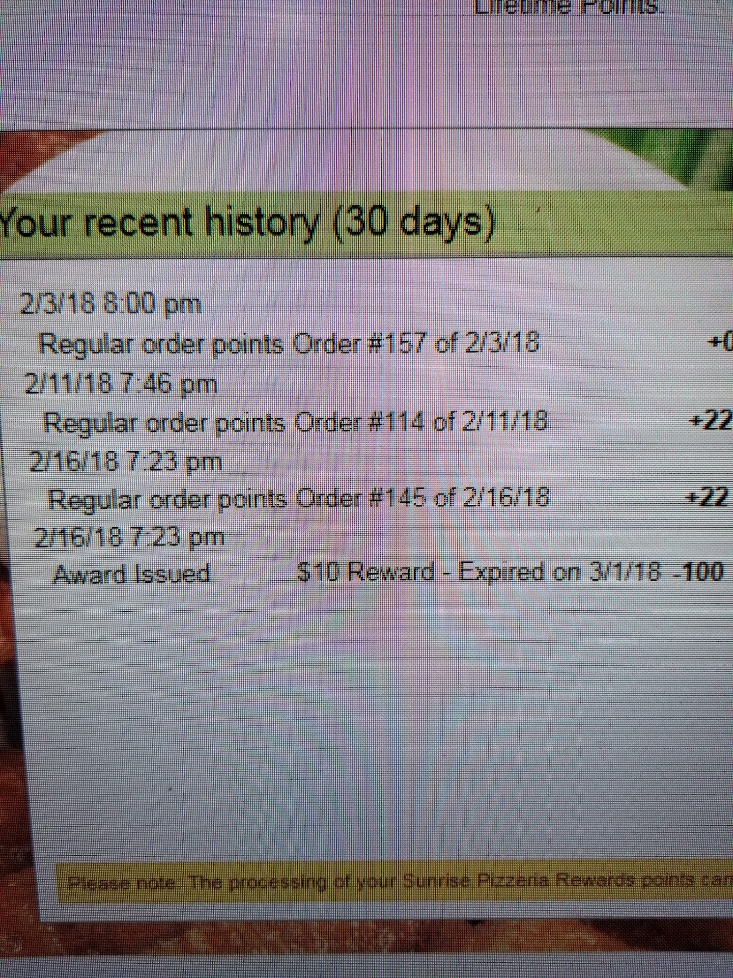 Read moreWow, they just lost a loyal customer. I will never order from here again. First, beware the "loyalty" points. Apparently they now have a 14 day expiration, which is fine now that I know, BUT when I called in today and spoke to Sarah she said she would honor the $10 off coupon I had earned through the program. Great I said as she told me to call back when i was ready to order that evening and tell them her name to get my $10 off. Guess what, didn't happen. I explained everything to 2 people and instead the manager tells me he is going to make it fair for "everyone" since he sees I have used a lot of coupons in the past. he will give me $5 off instead. He ignored my comment that 14 days was TODAY not yesterday. That's right, my last order was Feb 16, 18.......today is March 2, 18. Look at a calendar, that is 14 days. They are saying March 1 is 14 days...sorry this is not a leap year. Simple math.