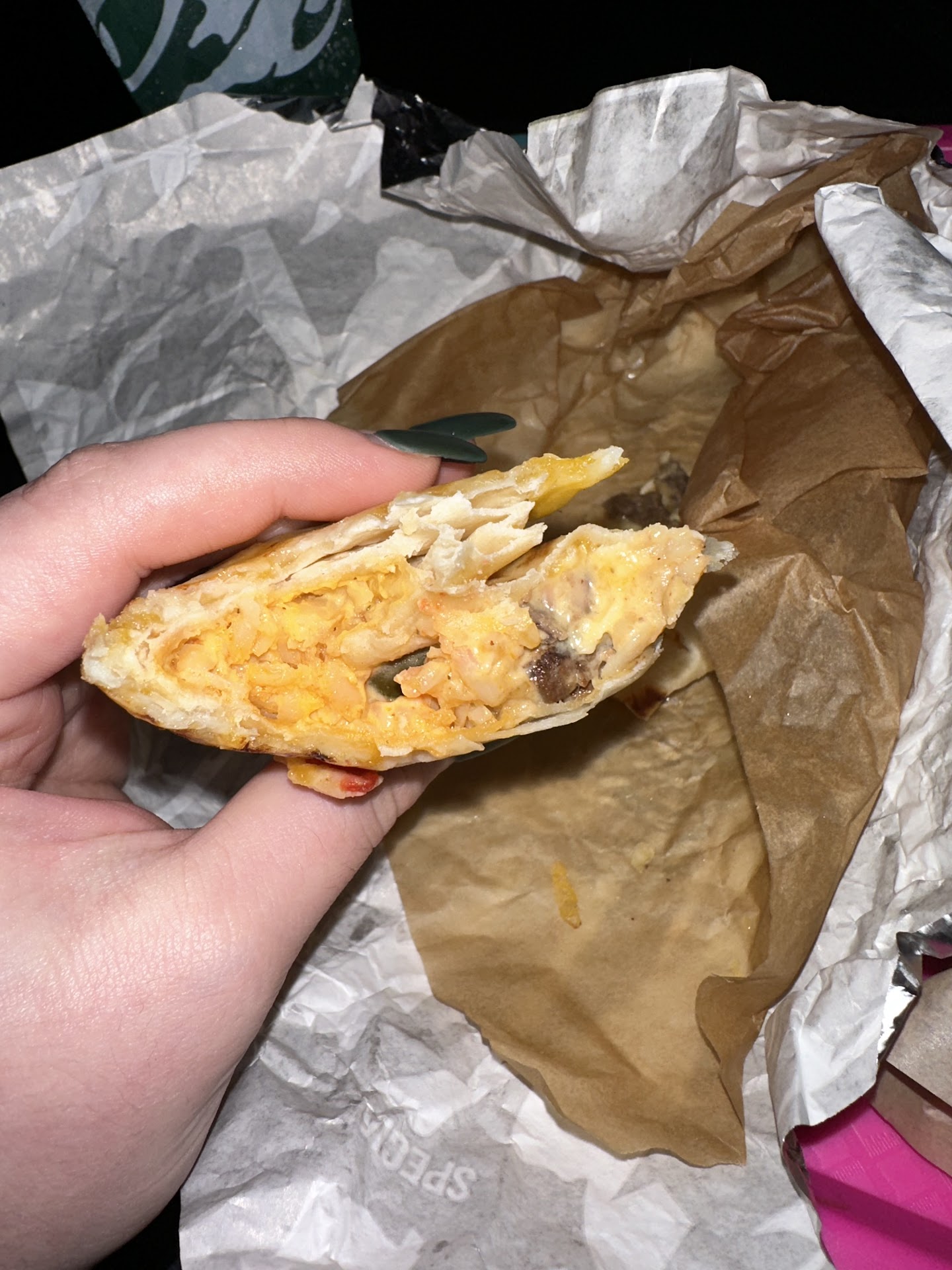 Stopped by to grab some delicious food. Drive thru line was long, so I decided to park and walk in. Upon entering, I noticed the place appeared quite tidy and I was acknowledged by a member of the staff. So far things are going quite well... I placed my order for: 1x Spicy Cheesy Core Burrito, emphasizing that I would like it to be Chicken and 1x Chicken Quesarito...