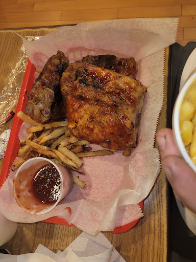 ALL of the food was delicious and hot when we got it. The fries were hand cut and crunchy. The ribs were fall off the bone and juicy. We tried the Mahogany Sauce and House BBQ Sauce. Both were great but I personally enjoyed the House BBQ Sauce more. The Potato Salad and Coleslaw we very good as well.