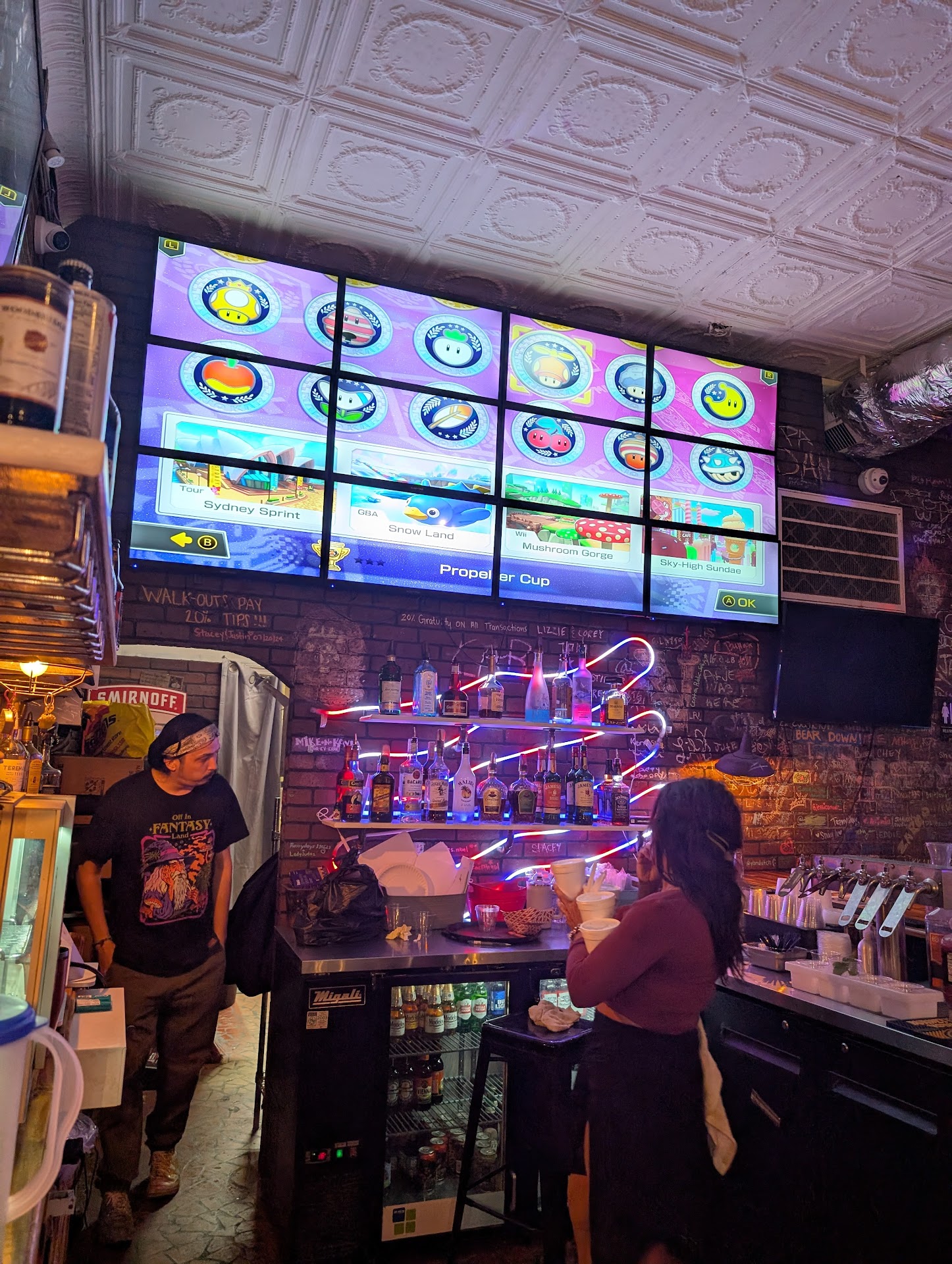 Normally I'm not a guy that enters a bar but when I see Mario Kart on the main screen from outside, automatically piqued my interest. Didn't realize the name of the place until much later. I decided to order a colada crush (not bad, felt a bit weak but ok it's like a spin-off on a pina colada) and the 3 piece tenders ( that were bomb btw. Tasty, crispy and juicy.) Sheldon the server was also super nice. Why 4 stars? Well I don't know if it's normal to be charged a 4% card fee plus a 20% service charge (on the wall it says gratuity) since I'm new to this type of place. But the video game on the screen ( they had basketball on another TV) , plus drink and great food did it for me. They make up for the cheap price of the food off of the service charge I guess.( I tipped as well) Will I return? Absolutely! The food and the ambience was just perfect for an introvert like me. (Even if things may be pricey I guess. Again not sure about prices in places like this) But loved it. Made my night and got a light buzz. Might've even salvaged my Memorial Day...