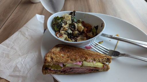 Located in the hotel lobby that doubles as the eating area for breakfast for hotel guests. One friendly employee was doing it all, working the bar, and serving 3 tables. They had happy hour drinks and food till 7 pm. We Also came for restaurant week for dinner and it was a great deal with huge portions. Food was tasty. I had the shrimp, pork chop, and carrot cake. The shrimp first course was large enough to be a dinner. The cake was the biggest size I’ve seen, it could of been cut into 4 regular size slice. Cake was moist and flavorful. The broccolini was spicy, had a good crunch, and cooked well. According to menu, the dish should have come with asparagus, but instead I was served the broccolini. I forgot what vegetable it came with, but something to check. The grilled peach jam was sweet and flavorful and complimented the pork. My only complaint is I wish there was more pork chop. Mashed potatoes were a little dry and lacked some flavor, but not bad. Atmosphere was okay, but was cozy and nice for being in a hotel lobby. Could have had more staff, but with weather, understandable that there would be less. Definitely a great place to stop for dinner during Restaurant week, and have a huge yummy 3 course meal...