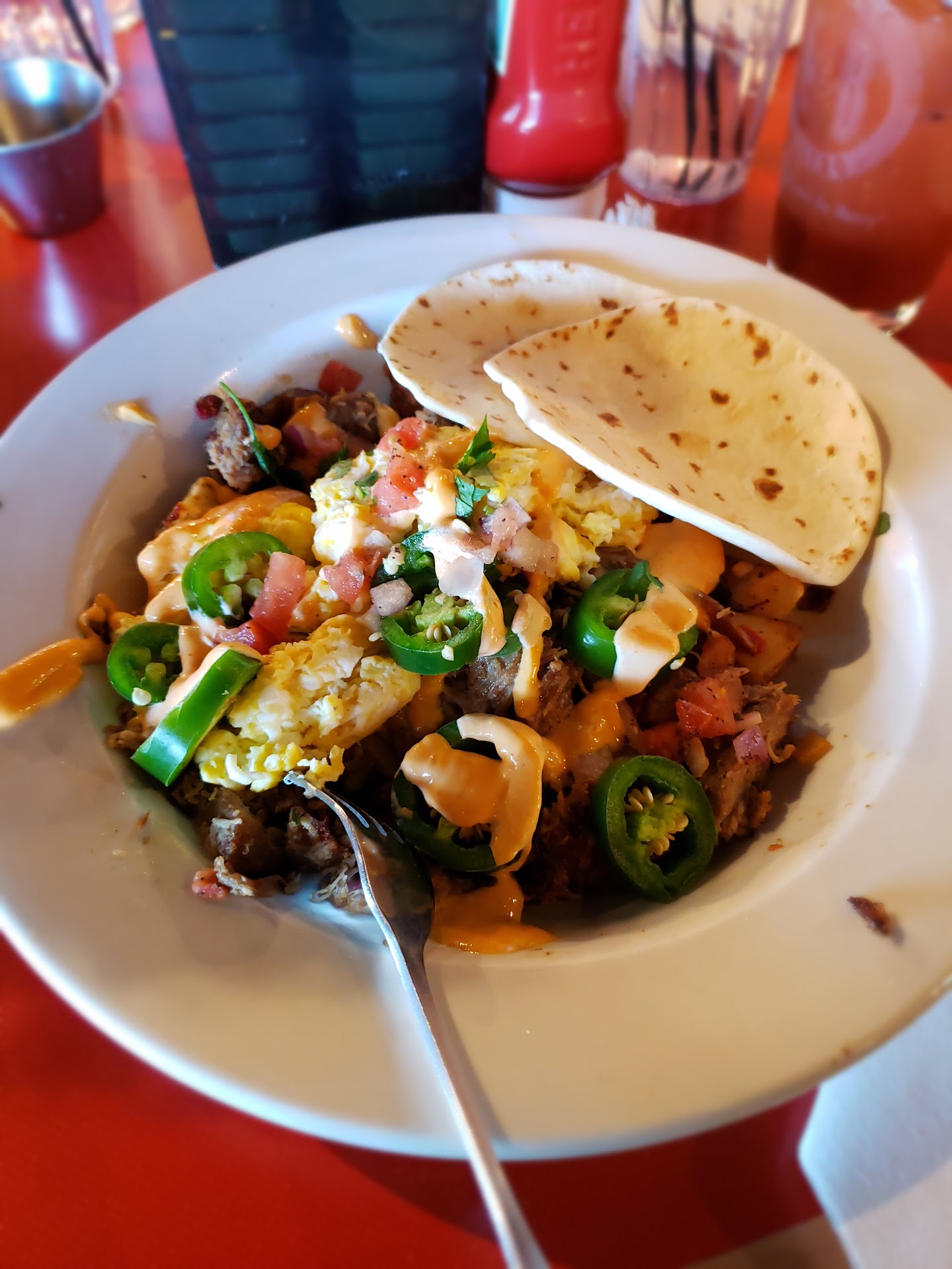All that bitterness aside, the food was pretty good. Ordering a sandwich at a brunch place was probably not the wisest choice; it was on par with a lower end Jason’s Deli. The chicken and waffles were pretty bland overall, but the hash browns were good. We’ll pick something else next time.