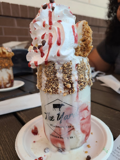 Read moreI'm not a boy, but the milkshakes sure did bring me out to The Yard! It's too bad there aren't many gourmet ice cream restaurants in Newport News... Anyway, I was in VA Beach, so I decided to pay this place a visit. The physical location of this establishment isn't the best. It's off VA Beach Blvd, so there are plenty of other restaurants in the vicinity, but of course there aren't many like this one. This milkshake shop is located on a small strip with a few other businesses. The parking is terrible. Considering how popular this shop is, there isn't enough seating or space inside to accommodate all the patrons. The two times I've been here, there was literally a line out the door. The first time I visited, I turned around and left because the line was out the door and down the pavement (AND it was raining outside!). No thank you. Went back the second time, the line was still out the door, but it was a wee bit shorter than the first time, so I stood in line. Made it to the inside of the shop and was taken aback seeing how crowded it was. Anyway, they have a variety of flavors and creations. Very few options for lactose intolerant persons, but at least they have options. I ordered the Berry Key'd Up milkshake. My 2 friends ordered the Peanut Butter Finger Waffle Sundae and the Edible Cookie Dough in 3 flavors. There was no room to sit inside the shop, so we went outside. I like that they have seating available outside on the side of the building, but it smells horrible out there. It was already hot and humid, but adding on the smell of dirty mop water and flies buzzing all around - that was the worst. The staff brought our orders to us outside. My milkshake was delicious - VERY VERY sweet - but then again, what else would you expect from a milkshake that's piled with sugary topping after sugary topping after sugary topping? And if I hadn't already eaten a whole calzone minutes before ordering this dessert, I probably could've eaten/drank the whole thing! There's a small area inside the shop where 2 sinks stand. You're able to rinse out the jars (hot and cold water available), dry them with paper towels, and place the jars in a plastic bag to take home. I love that idea. Anyway, I took off a star for the location, parking, overcrowding inside, and horrible smell outside. Positive rating goes to the staff, the dessert options, the presentation, and the flavor! I'll definitely visit again (whenever I'm on that side of the water and in that area again, and feel like waiting in a long...