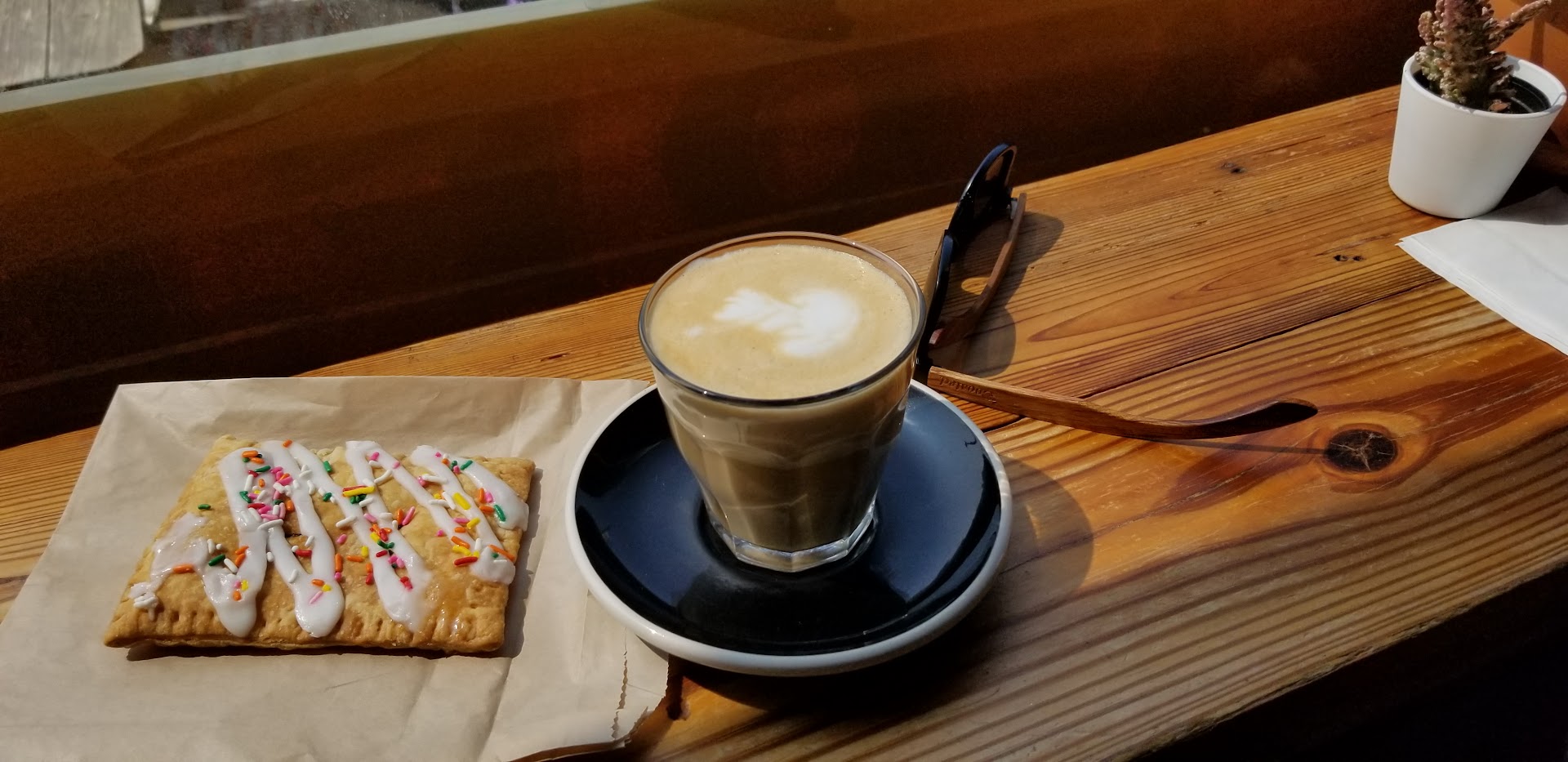 Once we arrived, we were impressed by the cool feel to the coffee shop, but disappointed with the service and especially the coffee. It was about 9am on Sunday (6/26) and we ordered a Landlubber cold brew coffee and a regular pour over. The iced coffee was served quickly which was great but was really acidic and bitter for a cold brew, vanilla coffee. Just not a good flavor at all. The pour over took 20 minutes to serve because the staff simply didn't get around to doing it. So, I got back in line to ask if I could swap out the pour over to a latte for my wife, but the cashier didn't want to since the other barista had JUST began my pour over as soon as I got to the register, so I offered to just pay for a separate latte. She apologized for the inconvenience but didn't let us trade out drinks either when I told her we didn't like the iced coffee. She just shrugged and took payment for the latte. The pour over was worse... It was mostly watery and tasted of burnt coffee. I spent a total of 19 bucks for two awful coffees and one good latte. To be fair, my wife LOVED the latte that came after and liked the second baristas attitude when she offered to make it sweeter if needed! Shout out to her!