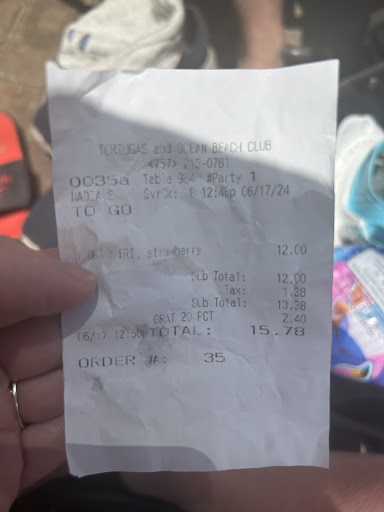 Read moreI am an owner of a timeshare at the Oceanaire resort that tortugas makes all their money by offering poolside food and drinks. I come every year and know the drinks I like and that prices go up yearly due to inflation I get that. However. Yesterday I ordered my daiquiri … 12$ with tax is 13.27 or close to that (.20 something). Drink is brought I pay and tip and away she goes - great service. Today however I get some entitled worker with red dread locks in a bun who can’t manage a smile and assumed because I asked a question I don’t know the prices as I didn’t have a menu in hand . Turns around and charges me 4$ more for the exact same Drink as yesterday. When I asked for a receipt she seem flustered and came back with a receipt she added an extra charge too so that the price made sense that she tried to con me out of extra (which isn’t the standard as it didn’t happen YESTERDAY). She must’ve been so flustered she forgot how to do math because there’s still 2$ missing from my change even with her extra charge. So now my 12$ drink that I get daily has cost me 18$ and I could’ve got almost another whole drink. She instead of apologizing and rectifying the issue decided continuing to try and steal from me was the correct way to handle the situation. I wont be paying for anything in my many years to come from here again. Enjoy staying open with my maintaince fees that keep you guys open. Imagine how many people she does this to in a day?!?! Stealing is NEVER ok. Especially on people she assumes are...
