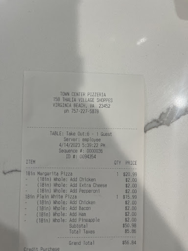 Read moreI have ordered food from this location on numerous accusations, today will be the last time I do so! I ordered two separate orders of wings and a meat lovers roll. The wings were placed in the same container and they were for two separate people. The meat lovers roll was crushed and there wasn't even a resemblance of a box it was FLAT and covered in grease! The delivery drive was very apologetic, as it was her first day. I see lack of good management, they sent her to deliver 3 different orders so she stacked it on top of each other explaining my crushed meat lovers roll. Then she had NO CHANGE! I had a $50 bill to cover the cost and the bill was only about $35, seriously! So i called the restaurant to express my concerns, and the manger says, "oh it's the drivers first day" and that is an excuse for lack of service why? I politely told him i was not happy, he responds with "Give her back the food and you don't pay"... This does not solve the problem. I am very unhappy and will not be ordering food from Town Center...