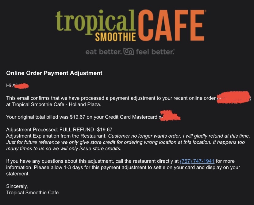 Read moreChoose a different tropical smoothie location if possible. Yes, they make your orders correct and it tastes great. BUT the service is not good. Two experiences. The first, i took the time to complete a survey that this location sends via email after purchasing (email attached). I then received a coupon. However, when i showed the coupon to the cashier: she told me it couldn’t be used and she had never seen that coupon. WHAT? Second experience: I moved and accidentally sent my order to this location. I called for HOURS to explain and receive a refund. No answer. I left a message on the voicemail. No call back. I was in the area later on that night and went to the store. I explained the situation to a cashier who then explained it to a team lead just for her to walk up to me and ask “so what happened?” HE JUST TOLD YOU. I explained again. She says “we can’t refund in the store if you ordered online, we’ll have to have the manager do it tomorrow” i explained i do not live in the area and no one answered but i left a voicemail. She says “we don’t check the voicemail” WHAT? At this point what she’s saying makes no sense nor is it resolving anything. Another team lead stepped in and said she’d come in the next day and explain to the manager what happened. I wrote down my phone number and everything. If the manager called me, you called me. No one reached out or answered the phone. Clearly the entire team is incompetent. So i called corporate who apparently contacted the manager to give me a refund and i received this email...long store short: incompetent,...