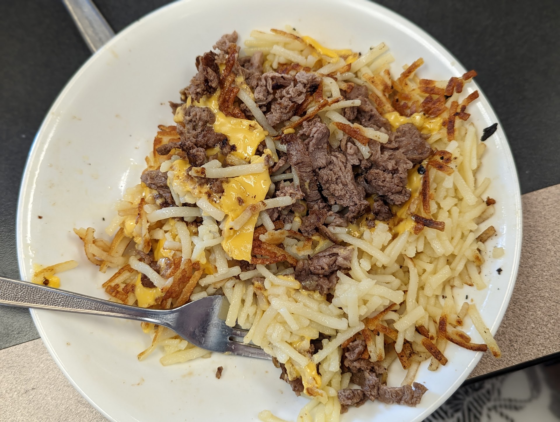 The omelette at first bite was light, fluffy and plenty of cheese. Subsequent bites revealed meaty strips of steak and cheese. Deliciously fluffy throughout. Loved it The hash browns I had were scattered, smothered, covered, chunked and topped. All the ingredients were cooked nicely crisp and complete. The outside potatoes had the crisp and the interior potatoes were tender and hot. The bacon and sausage that looked perfectly cooked were exactly that. Bacon was crispy and the sausage was cooked thoroughly with a nice crisp outside while the interior was tender and juicy.