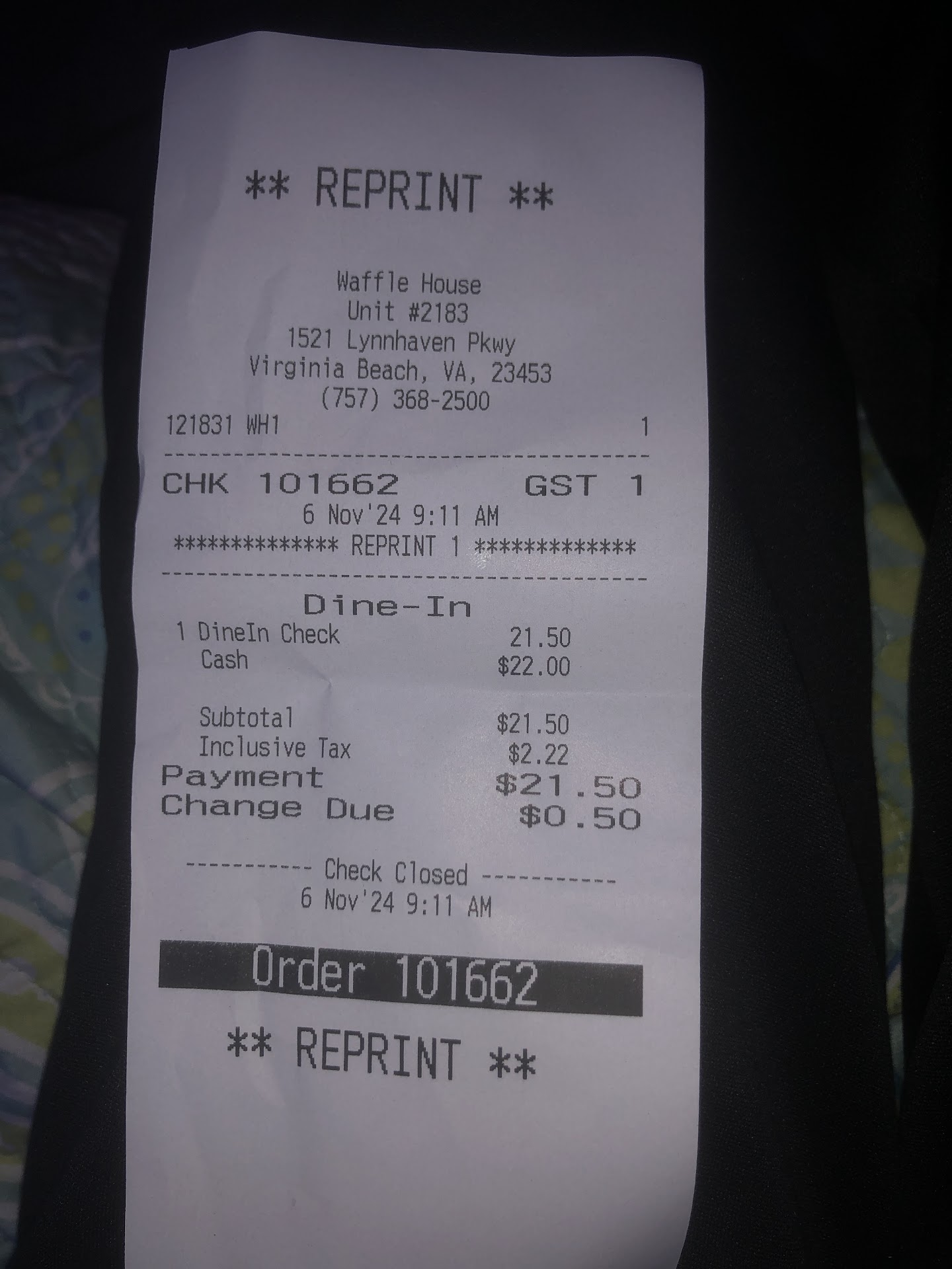 Read moreThis is a frequent visit for me and my friends/family or just me and my partner to go out and eat. We’ve never experienced any problems here and our food is always great. Today was the first time we’ve had an issue with no solution in our opinion. We first got asked what we decided to order, the three of us all got the breakfast meal so when she asked us if we wanted sausage or bacon we didn’t even question it without realizing. We were then brought very burnt waffles, bacon, and sausage and ate none of them. When she came back to the table with our receipts because me and my partner got a separate check from our friend. She had listed the all star special meal which we have no clue how you can confuse the words breakfast meal that’s 6.25 for a meal labeled completely different for 11.50. That’s when I said something confused and asked is that why we got all this extra food that we didn’t ask for, which either way was burnt and uneaten. She gave us 1.25 off each meal, when originally we would have payed 13.50 vs paying 21.50 and that was after she took off the “discount” so either way we payed way more than we originally should. When I was gonna ask more questions they completely avoided eye contact and our table so we just went up and payed as I am not in a mood to argue early in the morning and decided to just say something here. Hopefully something is mentioned so that this issue can be fixed for a future reference and or we can be accommodated for y’all’s mistake. Thank you and have...