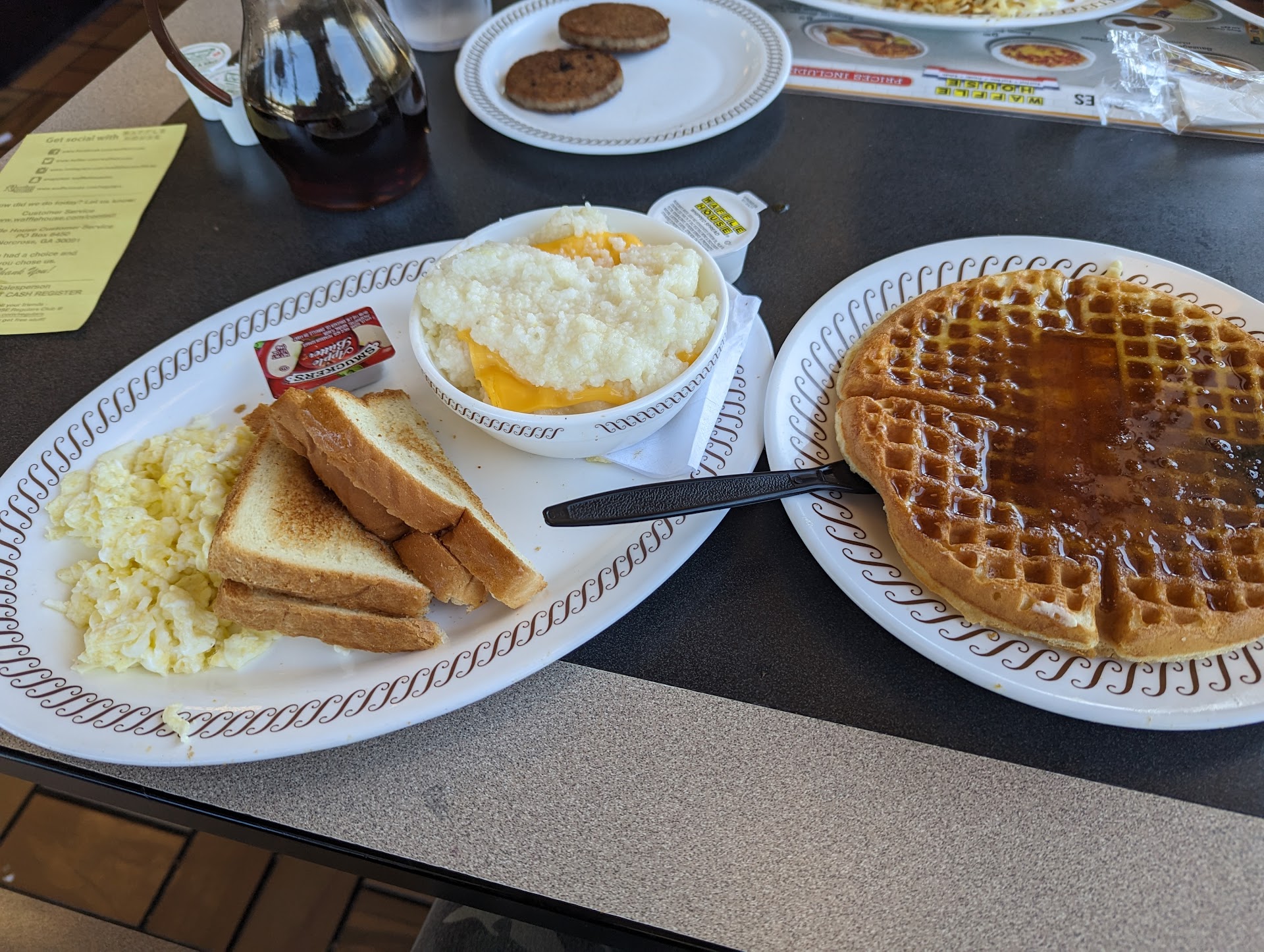 Read moreThe food was great! Service was not. The restuarant was not that busy. Yet We had to wait several minutes for our server to even acknowledge we were there. Then she only dropped off plastic knife and fork in a sealed plastic bag. Did not even ask if we wanted something to drink while we waited for her. When she finally came and got our drink order she took the food order as well. She brought out coffee in regular cup. Soda was served in recycled paper cup with a lid that was to big. We ordered our food and she walked away. When our food came, she dropped it off with the check and left. Did not ask if we needed anything else or anything. She had forgotten our waffles. We were done with everything else before the waffles even got to the table. Again, dropped the food and left. Not asking if we needed anything else or anything. No drink refills were ever offered. I had to flag her down and ask for soda refill.... Food was excellent!...