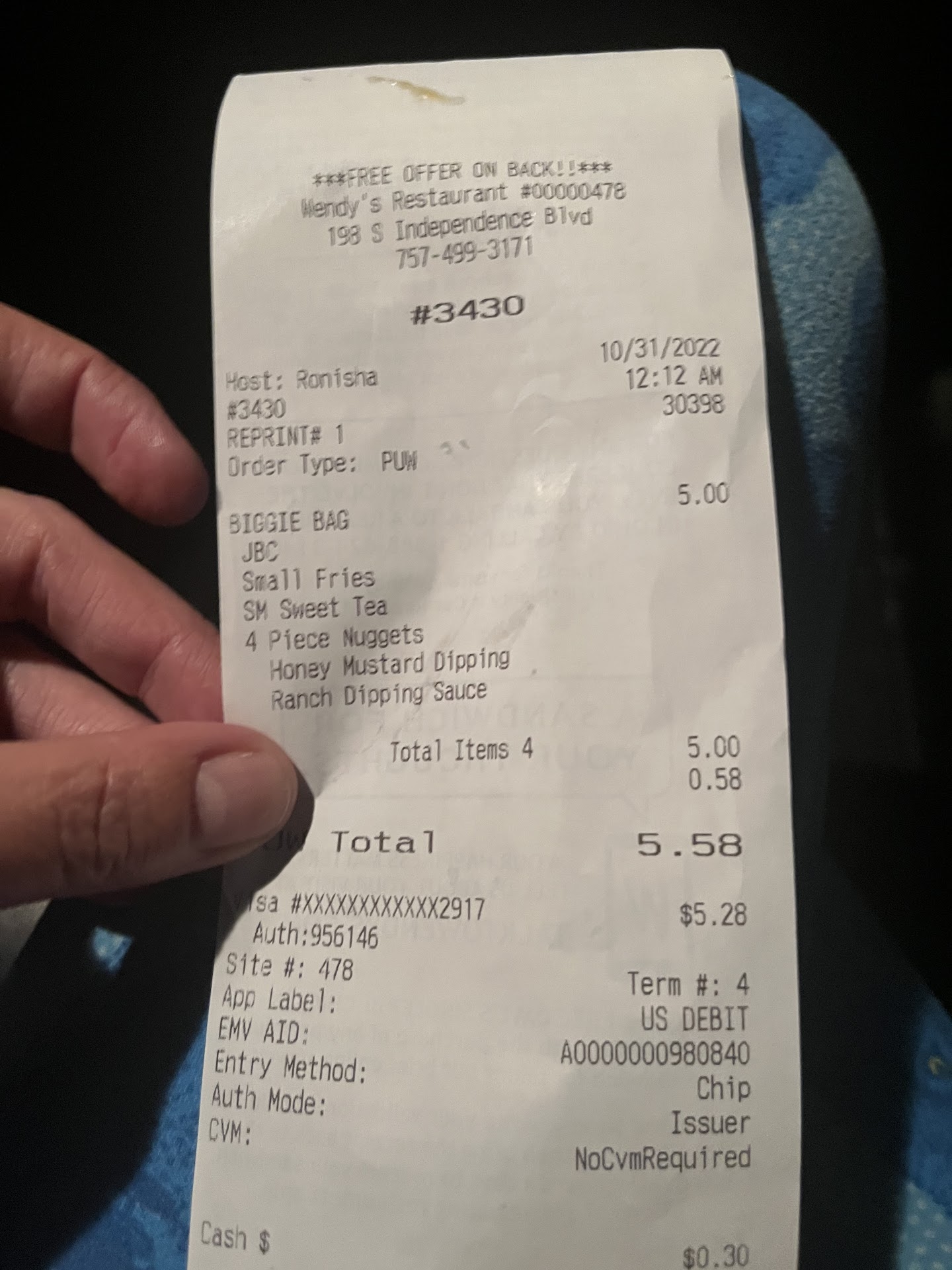 I usually have decent experiences at this Wendyâs as itâs my 16yr old sons favorite food. We go several times a week. Tonight, I had the unfortunate time of having Ronisha as my drive through person. She was very rude. Could barely hear her on the intercom, then she abruptly ended speaking to us and told us to pull up. No niceties, no couth. When we pulled up to pay, we inform her that we need to put 5.25 on our card then pay the rest in change and there it is. She looked at us like omg. Really? We get our food quite quickly, discussing with my fiancĂ© her attitude issues, I tell him to ask for the receipt. When he does, and also for a straw, she scoffs at him, turns around and out loud says, âOMGâ. So, he tells her, âthe reason I asked for the receipt is because I wanted your name.â Instead of apologizing (sheâs wearing a manager shirt!) She says, âgood! My name is right on there!â Wow!! How unprofessional and rude!!